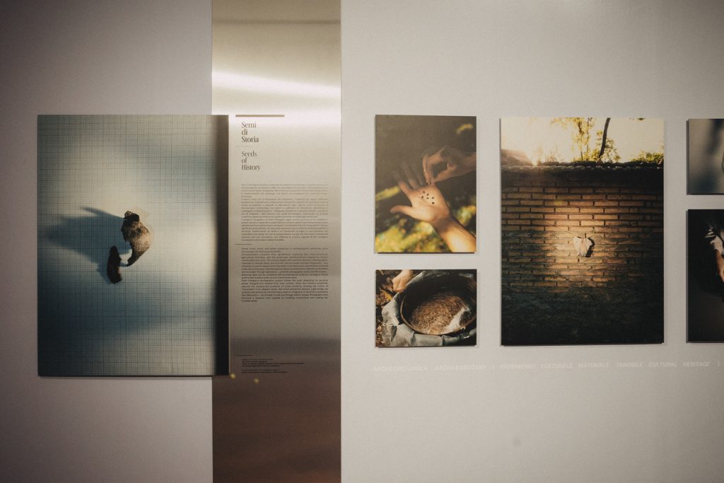 Il percorso si articola in due sale al piano terra ed è strutturato in spoke, aree tematiche che corrispondono ai diversi ambiti di ricerca del progetto. L’allestimento è ridotto all’essenziale, con pannelli in cartongesso che rivestono internamente il perimetro delle due sale, su cui sono affisse stampe fotografiche e testi su supporti in alluminio. In ciascuna sala è collocato uno schermo interattivo dedicato alla restituzione degli esiti di una ricerca specifica, che integra il percorso fotografico con materiali video e digitali. All’ingresso, un dispositivo touch dedicato al restauro di una pala medievale introduce uno dei temi centrali della mostra: la visibilità dei processi. Attraverso la scomposizione degli strati materici e pittorici, il restauro è presentato come pratica conoscitiva prima ancora che conservativa. Altri spoke affrontano ambiti diversi, dall’archeobotanica allo studio del paesaggio, dalla digitalizzazione del patrimonio librario alle sperimentazioni sui digital twin, repliche virtuali realizzate tramite scansioni 3D utilizzate come strumenti di implementazione di studio.