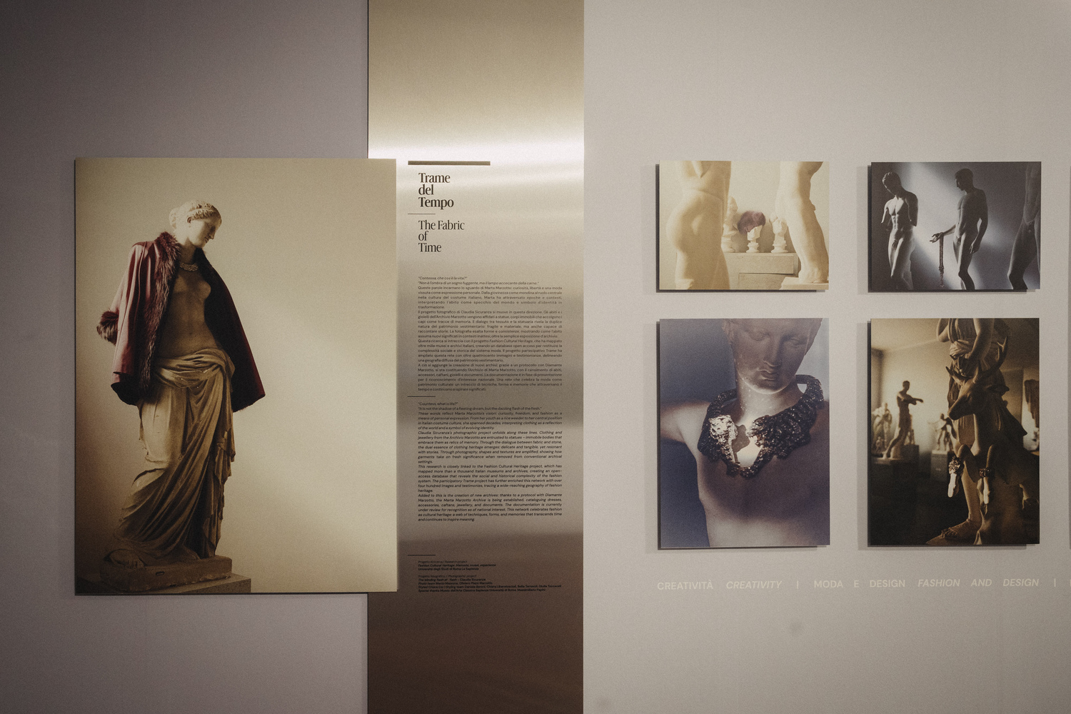 In Semi di storia, dedicato all’archeobotanica, la fotografia accompagna il racconto delle pratiche di estrazione, analisi e catalogazione di pollini e semi provenienti da siti archeologici italiani, restituendo il patrimonio come traccia materiale di ecosistemi passati. Di particolare efficacia risulta il progetto Trame del tempo, focalizzato sul patrimonio della moda, che mette in dialogo abiti dell’archivio di Marta Marzotto con sculture antiche del Museo di Arte Classica della Sapienza. In questo caso la fotografia analogica di Claudia Sicuranza, che con lunghi tempi di esposizione valorizza la matericità degli indumenti e il loro carattere immateriale, evidenzia il contrasto tra la fissità dei corpi statuari e la presenza dell’abito. L’accostamento, volutamente dissonante, introduce una nota ironica che allontana la lettura celebrativa e restituisce il patrimonio vestimentario come qualcosa di mobile, trasformabile e riattivabile.