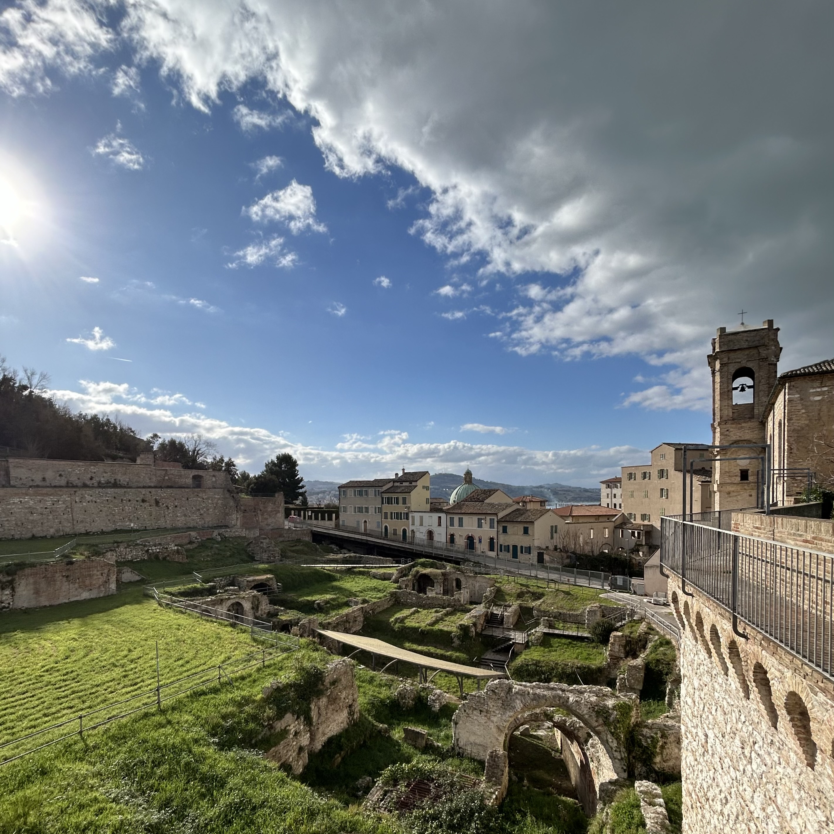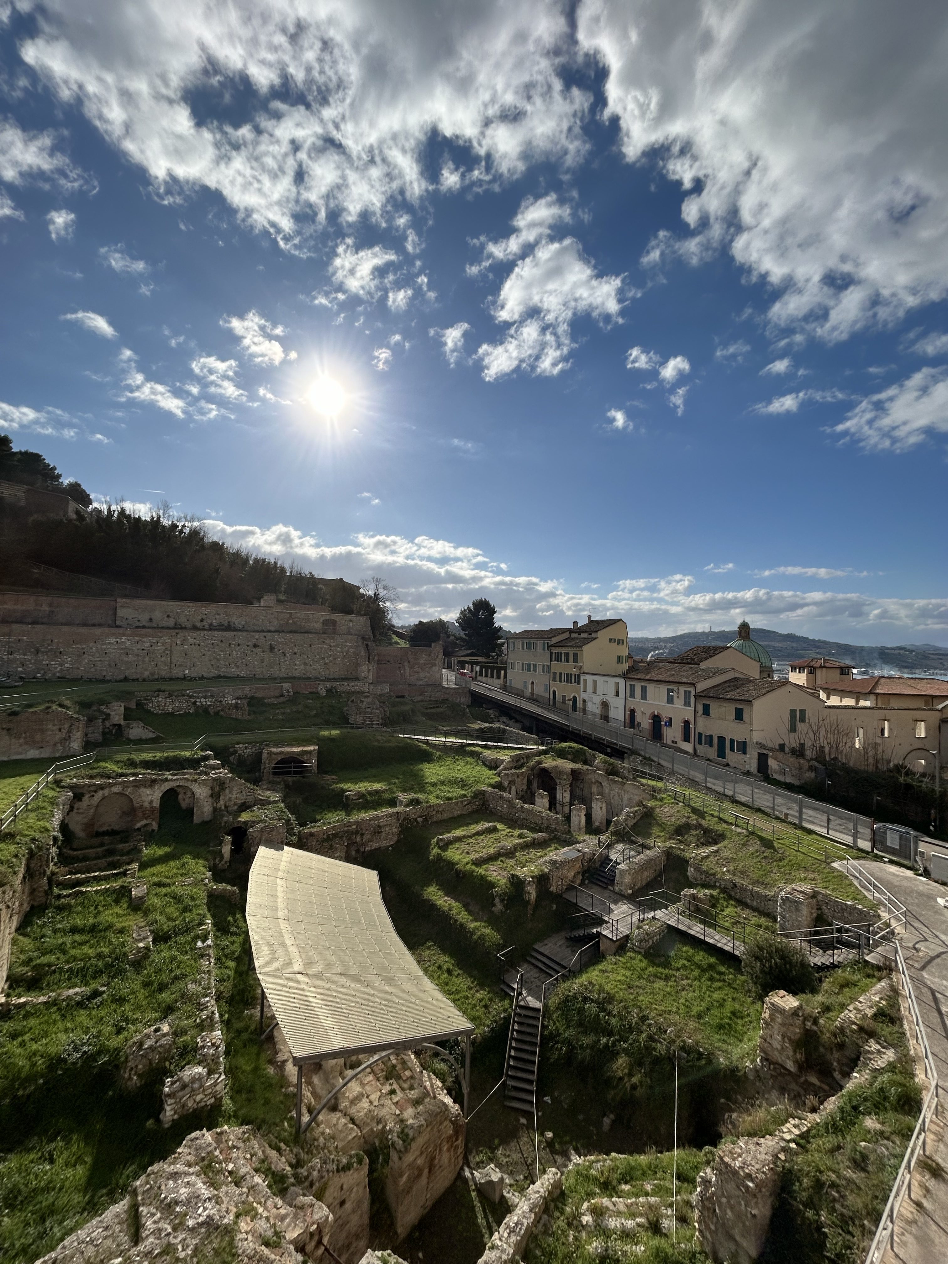 Situato nel cuore storico di Ancona, incastonato tra il colle Guasco e il colle dei Cappuccini, l’Anfiteatro romano rappresenta un punto di connessione tra la città e il mare Adriatico. Costruito in epoca imperiale su preesistenze ellenistiche, il sito ha visto la sovrapposizione di diverse stratificazioni storiche: prima convento e poi carcere di Santa Palazia, distrutto dal sisma del 1972, oggi racconta una storia millenaria che intreccia memoria urbana e paesaggio culturale. Le sue terrazze, in particolare il cammino di ronda dell’ex carcere, offrono una vista mozzafiato che spazia tra la città storica e le falesie sul mare.