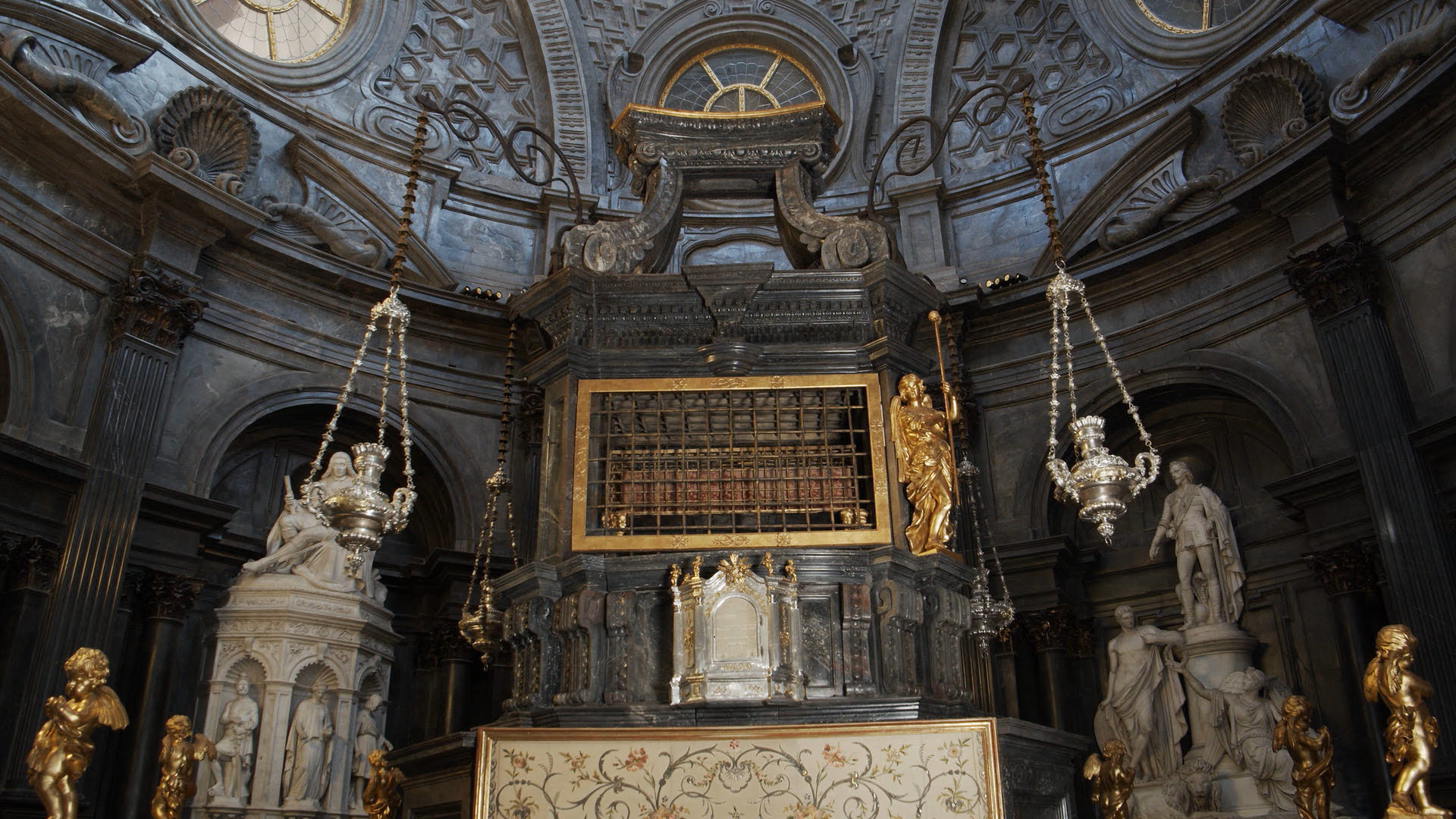 L’altare della Cappella della Sindone fu invece commissionato dal duca di Savoia Vittorio Amedeo II e progettato dall’ingegnere e matematico Antonio Bertola, tra il 1688 e il 1694, proprio per accogliere la Santa Sindone, conservata nell’urna centrale dal 1694 al 1993. Il suo impianto si adatta alla forma circolare della Cappella e presenta due fronti, uno rivolto verso il Palazzo Reale e l’altro verso la Cattedrale. Simile a un gigantesco reliquiario, l’altare è in marmo nero di Frabosa, arricchito da decorazioni e sculture in legno dorato che risplendono nella penombra dell’aula centrale. Benché non si conoscano i disegni di questo progetto, è molto probabile che la struttura rifletta il pensiero scenografico di Guarino Guarini, il prete-architetto che, dopo varie vicissitudini, realizzò il progetto definitivo della Cappella, apprezzatissima anche dai suoi contemporanei per i mirabili effetti ottici e luministici.