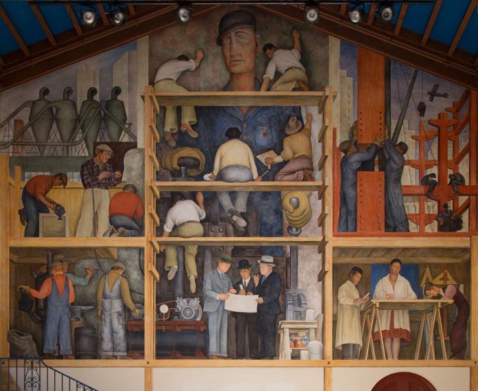 “La realizzazione di un affresco che mostra la costruzione di una città”, opera realizzata in situ nel maggio 1931 dal leggendario muralista Diego Rivera, è la protagonista dell’omonima galleria del San Francisco Art Institute, in cui vengono esibiti i progetti degli alunni dell’Istituto. Come indicato nel titolo, il murale di Diego Rivera ritrae la costruzione di una città e la creazione di un affresco, inclusi i vari soggetti coinvolti nella commissione, così come anche ingegneri, artisti assistenti, scultori, architetti e altri operai. Il ritratto centrale di un lavoratore con l’elmetto, rappresentato in proporzioni sovrannaturali, è visto come dimostrazione dello status che l’artista attribuiva alla figura del lavoratore industriale. Le opere di Rivera si concentravano infatti prevalentemente su questioni di carattere socio-politico, in particolare riguardanti la Rivoluzione Messicana, e ritraevano spesso lavoratori e artisti coinvolti in attività di rilevanza sociale o in presunte posizioni di potere.