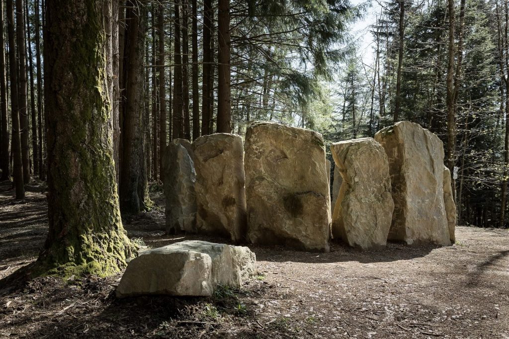 Il rapporto tra allogeno e autoctono è un altro aspetto che caratterizza tutto il percorso nella ricca flora boschiva che circonda sentieri e installazioni. Torniamo alle radici di questa riserva, scoprendo l’abete rosso, autoctono, e l’abete bianco, allogeno, importato dal Nord Italia. Da questa convivenza di specie diverse scopriamo come alcune siano estremamente competitive e rimodellino il paesaggio, e come altre siano più familiari e vivano in simbiosi. Questo comportamento è evocato dall’opera di Matteo Thun Fratelli tutti, il cui titolo riprende l’enciclica di Papa Francesco che richiama ai valori universali di pace e fraternità. In una radura, appena usciti dall’ombroso sentiero di abeti bianchi, c’è un insediamento che ci invita a fare comunità, a ritrovare noi stessi, abbracciando un destino comune.