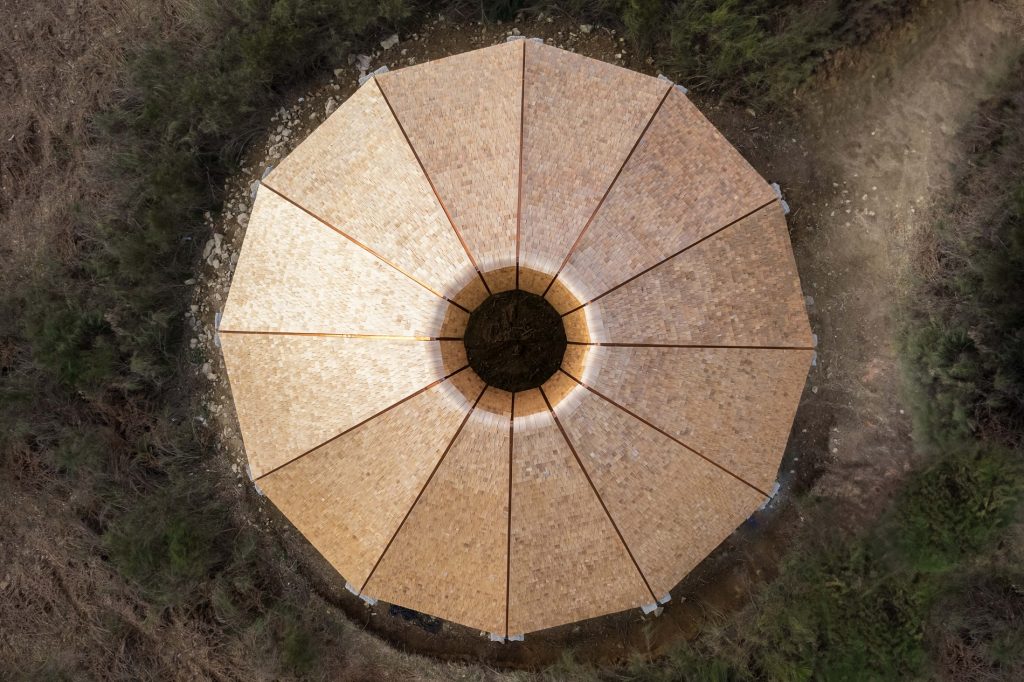 Il vincolo paesaggistico del parco impone di non costruire altri edifici all’interno della riserva, cosa che richiede un ripensamento costante del modo di fare architettura e di sfruttare gli spazi già esistenti: questo è ciò di cui ci parla Dynamo Pavilion dell’architetto Kengo Kuma. Kuma ci propone di riflettere sul legame tra pieno e vuoto con le sue enormi spirali in acciaio corten e fibra di carbonio che si attivano con il movimento del vento e con la caduta dei ricci dai castagni creando vibrazioni sonore. Dicotomia è anche inversione e questo aspetto è ben rappresentato dall’opera di Mariangela Gualtieri e Michele De Lucchi Nella terra il cielo, dove l’architetto De Lucchi costruisce un tempio laico senza utilizzare cemento o colle, ma solo legno di cedro, allogeno, e pietra serena locale. Attraverso le parole di Gualtieri, si attua l’inversione di un paradigma storico-sociale: solitamente, a partire da un mito, si giunge alla codificazione di un rito; qua, il rito, l’entrare nello spazio, fa emergere un racconto, di cui ascoltiamo la provenienza del poeta, il cui componimento è pura oralità: al di là delle strutture architettoniche, a rimanere sarà la parola poetica.