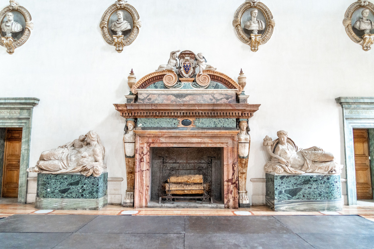 Con un camino alto circa quattro metri e cinquanta, il Salone d’Ercole di Palazzo Farnese si presenta in tutta la sua grandezza e maestosità. E ora è pronto per tornare agli antichi splendori con il restauro delle due figure scolpite e inguainate con quella stessa cavità che un tempo serviva per scaldare la stanza e oggi risulta una pregevole decorazione che funge da sfondo per i tanti eventi che si svolgono all’interno di quegli spazi. Se il Salone ha già oggi la capacità di incantare gli ospiti per la sua bellezza, in futuro è destinato a coinvolgere ulteriormente gli avventori, una volta che sarà completato il lavoro di restauro delle due sculture ai margini del camino. Si tratta di un’opera scultorea composta da una decina di varietà di marmi policromi, coronata da due putti che reggono lo stemma di Ranuccio Farnese. Le due sculture, giunte a Palazzo Farnese nel 1628 dal monumento funebre di Paolo III, suo nonno, a San Pietro, ricordano la gloriosa ascendenza del cardinale.