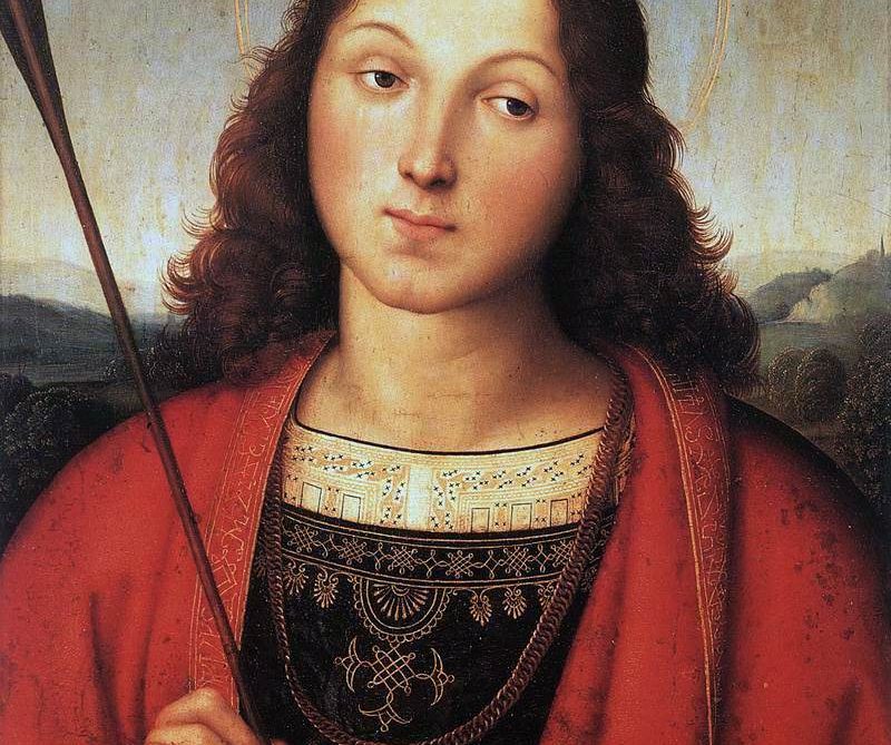 Considerando l’iconografia, ci aspetteremmo un San Sebastiano a figura intera, seminudo, sofferente e trafitto dalle frecce, simbolo del martirio delle carni. Raffaello, invece, ci stupisce con un mezzobusto avvolto in elegantissime e preziose vesti rosse, blue e dorate. Si vede solo una freccia, che il Santo impugna gentilmente come se fosse una penna, obliquamente, a scandire nettamente la profondità con una semplicità e una evidenza rarissimi da trovare in un’opera sacra dell’epoca. D’altra parte, la sua espressione non sembra particolarmente sofferente, anzi, il suo viso sembra esprimere una profonda dolcezza.