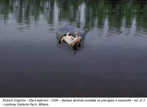 Standing #2 (2009) è letteralmente un uomo in precario equilibrio, sostenuto soltanto da un banale manico di scopa. È nuovamente il corpo dell’artista, stavolta nudo, nello scatto fotografico Stars Watcher (2006), a esser imprigionato in una teca trasparente che, come un modesta barchetta, va alla deriva. Oppure, nella foto Fish eye (2005), è la sua testa a essere incastrata in una boule per pesciolini.
