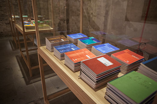 Libri anche nel lavoro di Peter Friedl, vetrine al cui interno ci sono 328 quaderni, diari che vanno dal 1985 al 2015.