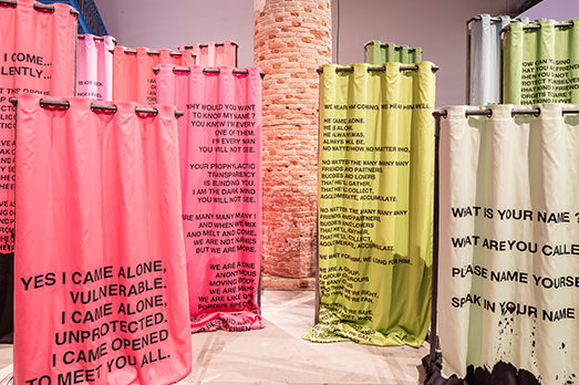Mentre proseguiamo la visita incontriamo Valentina Bruschi, curatrice siciliana, che richiama alla nostra attenzione un lavoro in cui di nuovo la parola, stavolta non scritta ma orale, ha un ruolo importante. Lili Reyaud Dewar, artista francese, che realizza performance che poi fa diventare oggetto di video, nei quali fondamentale è l’audio, costituito da parole, nenie meravigliose che cullano i visitatori.