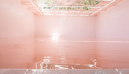 Avevo salutato ieri Patrizia Sandretto con la promessa che avrei avuto un occhio di riguardo alle donne. Così è stato. Non uno sguardo femminista, ma una ricerca limpida ed attenta. Ho deciso però di concentrarmi sui lavori per poi vedere il genere dell’artista. Così faccio, e mi aggiro tra i padiglioni. La Svizzera ha una fila piuttosto lunga, e questa cosa ancora non ho capito se ha un significato positivo; decido però di tentare. Dopo venti minuti mi trovo davanti un grande spazio, inaccessibile, dove si vede solo dell’acqua rosa che si muove leggermente. Una sensazione di leggerezza che ti invita quasi a provare ad entrare in quel luogo inaccessibile.