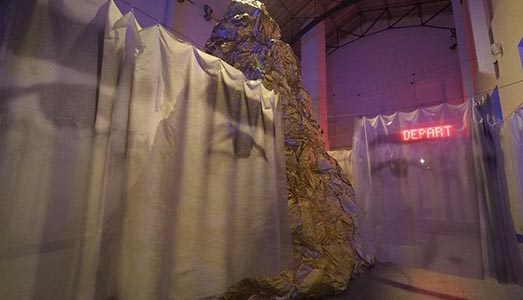 Si entra, poi, nel labirinto. La navata centrale è caratterizzata dall’installazione Regards: immagini sfocate stampate su tende che il visitatore può attraversare e spostare, ripercorrendo così le storie di quegli uomini raffigurati, ormai scomparsi. Al centro del labirinto, invece, sorge un’immensa montagna d’oro, alta circa sette metri, Volver, ottenuta con le termocoperte utilizzate per soccorrere i migranti. Il legame tra le due opere è sottile, ma intenso, il passaggio tra quei volti presenti, ma assenti ricorda i migranti, presenze anonime sempre di passaggio.
