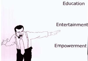 Le tre “e” al cubo costituiscono i sublimi must che dalla televisione defluiscono nell’every day’s life di masse “privilegiate”: “education” (educazione), “entertainment” (intrattenimento), “empowerment” (potenziamento)...