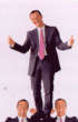 La sua figura si riflette nel segno del plotter in bianco e nero dove le parole ribadiscono i valori di cui si fa portatore, viene ritagliata e ripetuta serialmente a sottolineare nella ripetizione ossessiva e decorativa della sua sagoma, l’inevitabilità persecutoria della sua presenza e quindi l’inarrestabile flusso della sua immagine. Oppure si anima in una simpatica scultura in vetroresina, che si muove in una sincopata vibrazione elettrica irradiata nell’intero corpo. Il brusio di fondo del “pupazzo virtuale”, accompagnato dai gesti rituali del presentatore, diventa portatore di senso attraverso l’eloquenza comunicativa svuotata di senso di formule tautologiche. Raggiunge il pubblico e lo ammannisce attraverso l’uso esclusivo dell’imperativo e della ripetizione incantatoria. Il dover essere, nel quale credere, decreta il successo del personaggio anche politico, che necessita nella odierna scala di valori omologati di un novello magister elegantiarum: l’esperto di comportamenti e della moda, il semiotico visivo, il regista di una campagna di successo. Appartiene al mondo degli incantatori mediali, degli ipnotizzatori universali, la personalità – vate del dj, che visto in un’animazione 3d, argenteo e chino su due piastre, diventa un’altra nuova icona contemporanea. Forte è la tentazione di autoidentificazione, tant’è che il presentatore ha le sembianze dell’artista, abbacinato dal potere dei media, dal luccicante glamour di pixel che costituiscono l’alter mondo in cui credere e soprattutto attraverso il quale avere potere.