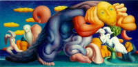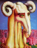 I suoi quadri, coloratissimi, dominati dal blu oltremare che accentua però il senso di malinconia, ospitano figure a metà fra l’uomo e gli animali, veri anch’essi o leggendari, o fantasiosi, con la testa sprofondata nelle mani, con lo sguardo perso, esseri mutanti. E’ stato chiamato in causa il Surrealismo, quello degli occhi piangenti di Dalì, ma soprattutto quello delle stanze “sottovuoto” di Magritte, o delle figure di Ernst, ma anche gli animali di Ligabue, e ancora le Muse di De Chirico o le fantasie di Alberto Savinio. Ma c’è dell’altro, ci sono almeno i ricordi dei grifoni e del bestiario medievale del Duomo di Modena, e soprattutto ci sono gli idoli indios, quei profili inconfondibili e gli zigomi pronunciati degli Incas o dei Maya. Un dialogo aperto con i muralisti messicani, con Ribera, con Siqueiros, spogliato delle loro intenzioni politiche e della forza della loro lotta, ma pur sempre vero, perché ancora una volta un dialogo al livello dell’uomo..jpg)