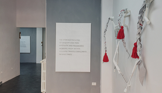 In mostra sono visibili una serie di quelle che vengono definite “protesi per l’immaginazione radicale” che permetteranno di ridisegnare un nuovo equilibrio tra umanità e tecnologia strizzando l’occhio alla spiritualità e alla “magia” (Amulet), come nella loro Macchina quantica, fatta di pelle, stampelle ed elastici così da innescare delle riflessioni, senza prendere una posizione netta ma sicuramente indicandone una. Protesi di una tecnologia interiore che creano una serie di lavori fortemente impostati sul numero 3 che, in particolare, caratterizza il collettivo dopo la morte di Nemes nel 2011. Ne sono esempio i Ballroom neuro e i moltiplicatori di piaceri estremi di The form is pregnant rispettivamente dedicati al sistema nervoso e all’apparato genitale o ancora le unità minime delle quali sono fatti gran parte dei lavori in mostra: mattoni, stampelle, cuoio (Sample bank). La mostra è fortemente intrisa della luce e del candore di un bianco che è metafora delle pagina di un futuro ancora da scrivere. Un processo questo, strettamente collegato a Suprainfinit, ovvero il tentativo degli Apparatus di immaginare un universo nel quale la speranza sia usata come strumento critico grazie all’influenza sovraumana del Fertility gods visibile all’interno di uno scheletro di lightbox dal quale vengono diffusi echi d’amore provenienti dagli antichi libri.