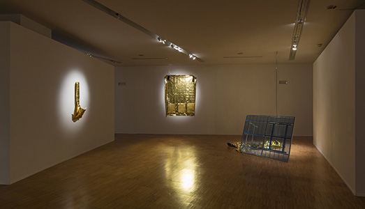 “Nel 2014 rimasi folgorata guardando al telegiornale gli immigrati seminudi al loro arrivo a Lampedusa, avvolti in coperte dorate. E con dolore colsi il paradosso di tanto splendore su tanta miseria”. Le parole dell’artista scritte all’ingresso della mostra danno la chiave di lettura per entrare in questo “inconveniente” (come recita il titolo), inteso come un fatto che si verifica senza essere atteso e che proprio per questo può suscitare stupore, dubbi, interrogativi. Vengono dunque presentate opere del 2014 che accostano deterrenti per piccioni a scarpe usate o coperte isotermiche, quest’ultime sfavillanti allo sguardo eppure utili concretamente in circostante spesso drammatiche. L’artista scatta un’istantanea della sensazione che ci assale quando si verifica un evento inatteso: in quella frazione di secondo si rimane sospesi tra il dubbio, il rifiuto o un senso di protezione.