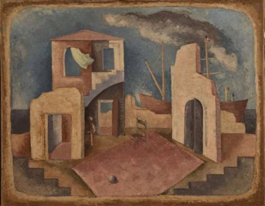 Personaggio principale del percorso espositivo è Renè Paresce, fisico, giornalista, cosmopolita e artista, amico di Picasso e Modigliani, che incontrava all’Ecole de Paris. La pittura dell’artista si lega al senso metafisico introdotto da De Chirico, ma a differenza di Savinio che reinterpreta il mito in chiave contemporanea, prevedendo il disfacimento dell’attuale realtà, la sua rappresentazione è frutto di fantasia. L’arte è gioco, “bisogna lasciare la realtà a fotografi e scienziati”, soleva affermare, l’artista deve sognare e riprodurre sulla tela i pensieri, i ricordi dell’infanzia, reinterpretando le immagini di esperienze passate. È proprio quello che accade nel quadro “pesca miracolosa”, del 1937, dove raffigura dei grandi pesci, ricordo di un viaggio in nave per la realizzazione di un reportage. Meravigliosa la scala cromatica dei colori scelti per le tele, che variano dal celeste, all’indaco, al verde, al rosso, resi ancora più evocativi e coinvolgenti, grazie all’utilizzo di una tecnica che richiama l’affresco. Paresce, profondo conoscitore della chimica dei colori, delle leggi della fisica, da fisico, ma anche degli avvenimenti e della situazione socio politica, da giornalista, diventa artista guardando la realtà con gli occhiali da alchimista, grazie ai quali riesce a realizzare opere immerse in una dimensione sospesa e onirica, dove convivono ricordo, attesa, muri diroccati, case senza tetto, ispirandosi alla lezione di Cezanne, ma arricchendola con l’esperienza metafisica, aspirando a una costante ricerca della verità, che neanche nella scienza era riuscito a trovare.