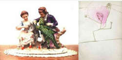 Questo mondo vive anche di contaminazioni in senso contrario: le piccole sculture (damine del settecento, eleganti principino) assumono degli atteggiamenti imprevedibili, compiendo azioni che appartengono al nostro orizzonte di vita (quali giocare a calcio, guardare la tv).
