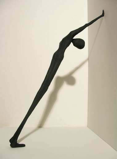 Aspettano seduti su un gigantesco totem di corda, si arrampicano su scale circolari, si appoggiano al muro, condividendone la stessa natura. E, infine, dormono, appesi a pioli, in posizioni precarie...