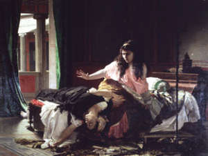 In tutto ciò, dispiace dirlo, a perdere è forse proprio la pittura. L’impressione di minore immediatezza che si ricava soprattutto da alcune tele, magari di notevole dimensione ma di non eccelsa qualità, imponenti nella loro ricostruzione dei costumi e delle stanze, dei corridoi, degli scaloni di palazzo dove si consumano le tragedie di un tempo che fu, ma bloccate nella rappresentazione di un solo attimo, congela lo svolgersi del racconto, limitando l’espressione ad un solo, muto “fotogramma” che non sempre riesce a concentrare in sè, come somma di momenti, tutta un’azione o tutta la forza del dramma che si sta svolgendo.