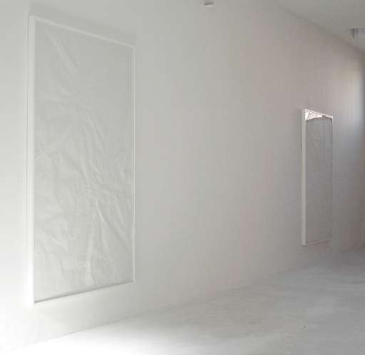 Table Cover (2006) o Rilasci, di Emanuele Becheri (Prato, 1973) permettono di intravedere sulla superficie piegata e poi distesa della carta che li compone leggeri segni a matita, astratti, illeggibili. Contraddicendo la loro stessa natura, i grandi “fantasmi” bianchi dell’artista toscano rimangono schiacciati, si appesantiscono, si rilasciano gradualmente. Mutano il loro aspetto, vinti dalla loro intrinseca fragilità.