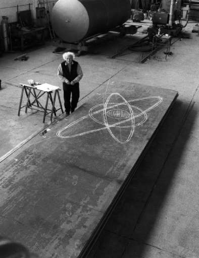 Mattiacci ha innalzato tre lastre pesantissime che si reggono perfettamente in piedi, rimanendo in equilibrio, sollevate da terra e appoggiate su pinze. Appaiono monoliti ermetici, destinati a comunicare con il cosmo, come grandi pagine di un antico libro di astronomia. Non a caso, dopo aver visionato numerosi spazi della città, ha scelto la periferia cittadina e lo spazio dell’ex Fonderia Lombardini, ora sede della compagnia di danza Aterballetto. Affascinato dall’idea della danza, ha collocato un’opera pesante e vigorosa proprio in un luogo dove si parla di leggerezza. E l’ha fatta –a modo suo– danzare. Il verticalismo e le misure seguono la linea del “fare grande” dell’ultima stagione di Mattiacci, quella più attenta alle leggi della fisica e del cosmo. Fin dagli esordi sulla scena romana degli anni Sessanta, l’attenzione dell’artista è sempre stata per i materiali, la sua notorietà nasce difatti col famoso Tubo, realizzato per la sua prima personale del 1967, un tubo di ferro nichelato, verniciato di giallo, esposto nello spazio della galleria La Tartaruga. Negli anni Settanta si dedica all’azione performativa comportamentale, ma è soltanto negli anni Ottanta che inizia a rivolgersi allo spazio cosmico, con una particolare tensione verso il cielo e i misteri delle galassie.