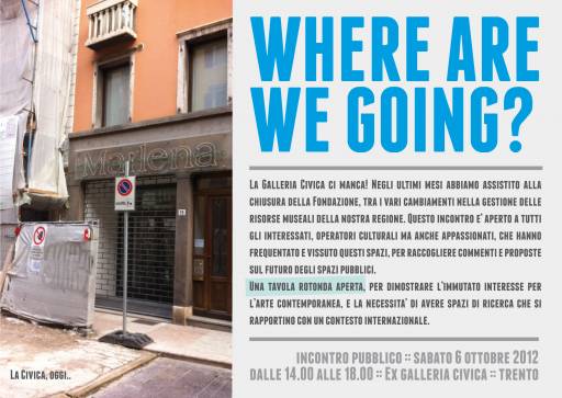 Questa volta a dire la loro sono in sei: Tatiana Festi, Federico Lanaro, Francesco Mattuzzi, Jacopo Mazzonelli, Valentina Miorandi, Laurina Paperina e Matteo Rosa. Sei artisti trentini che chiedono spiegazioni sul destino che attende la galleria Civica della loro città. Oltre a questa lettera aperta, per il 6 ottobre, giornata del contemporaneo, hanno indetto una tavola rotonda nella stessa Galleria per stilare un progetto da proporre agli assessori. Intanto, ascoltiamoli in anteprima