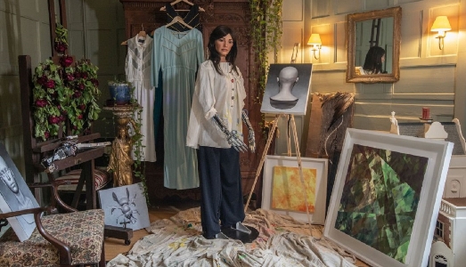 Indossa una camicetta bianca con sbuffi e bottoncini colorati, i capelli corvini le ricadono sulle spalle e incorniciano un volto dall’espressione concentrata, mentre è...