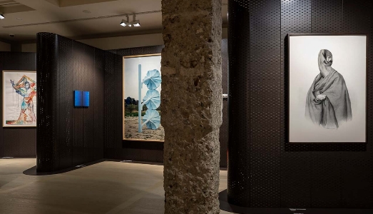 Oltre le colonne di ghisa e i pilastri, emergono, come da un immaginario scavo archeologico, 43 opere. Alcune a terra, altre appese a scuri...