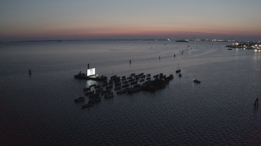 Dal 27 agosto al 5 settembre 2020, la laguna di Venezia ha ospitato il progetto “Cinema Galleggiante: Acque Sconosciute”, ideato da Edoardo Aruta e Paolo Rosso di Microclima, in collaborazione con importanti realtà culturali locali e internazionali. La rassegna cinematografica, con una ricca programmazione tra film, cortometraggi, video d’artista e interventi artistici diversi, ha avuto luogo nella secca retrostante l’isola della Giudecca, dove gli spettatori hanno potuto vedere le proposte cinematografiche direttamente dalle proprie imbarcazioni o attraverso una piattaforma galleggiante pensata per il pubblico senza barca.