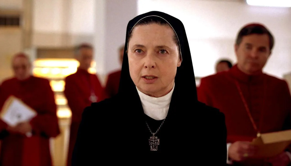 Isabella è così, un astro autodeterminato dentro la vita, la sua, capace di fare l’amore con la mitologia dell’oggi, decidere le sorti di quelle storie e poi uscirne placidamente integra e definita, come una divinità romana con i tratti morbidi di una ninfa plebea. Appare in fiction strane come quella in cui si fidanza con il Mago Merlino interpretato da Sam Neill (Merlino, 1998), in passato è innamorata e innamorante nei più improbabili flirt (Gary Oldman come Christian De Sica), sempre tutelare di una testimonianza privilegiata ma preziosa, quella dell’indipendenza assoluta del sé. Vende pozioni magiche a Meryl Streep e Goldie Hawn, giace in monologhi sulla natura fatti di cartapesta (il suo Green Porno) e oggi siede nella sua magione – ex stalla – da qualche parte a Long Island, a tirare le fila della faticosa dinastia Rossellini di cui è leader indiscussa (vedere ancora The Rossellinis per credere) e infine, come nel suo debutto, torna a fare la suora (è Suor Agnes in Conclave, qui la recensione del film) per una candidatura a un Oscar da non protagonista che ha tanto il sapore del premio alla carriera. O meglio alla vita, la sua, buona per una reincarnazione. «Amore antico, amica mia».