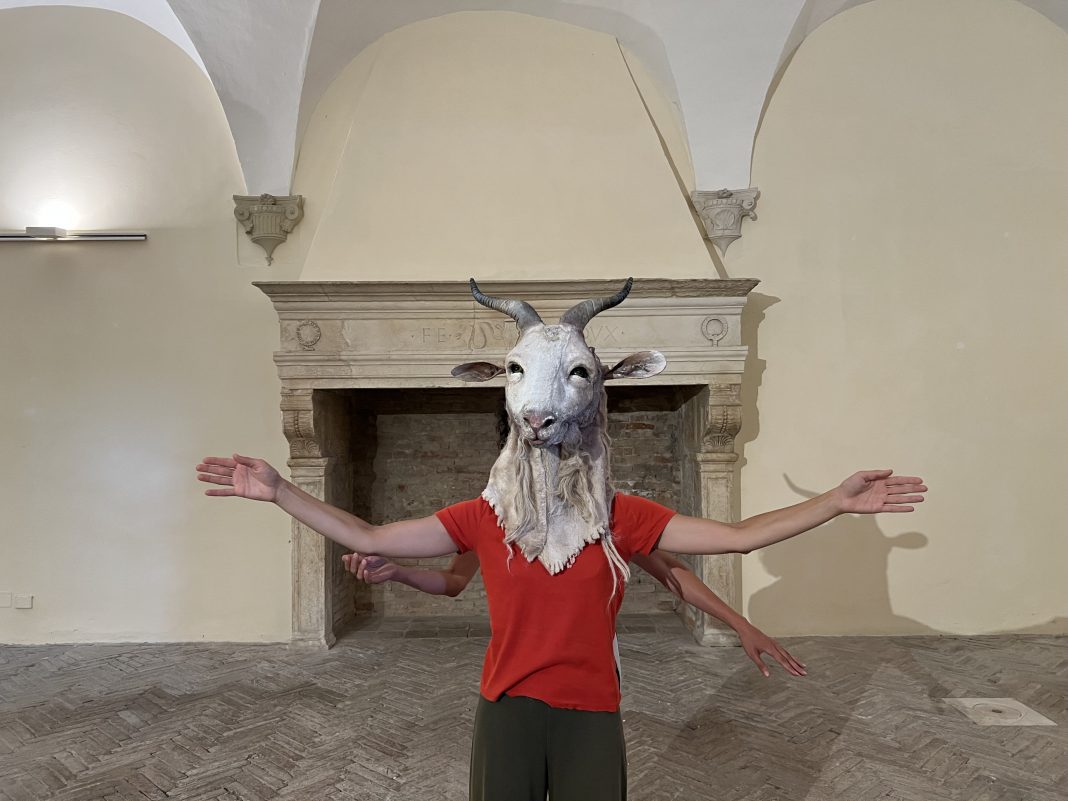 Si inizia dai sotterranei di Palazzo Ducale, scendendo scalinate e attraversando corridoi, per giungere dentro ampie stanze appena illuminate da finestre in alto. Spostandoci da una stanza ad un’altra – la cucina, la selleria, e la stalla – sostiamo davanti a tre performer con maschere raffiguranti una testa di cervo, una di capra, una di cavallo. Li osserviamo nei loro lenti movimenti di riposo, di sonno, di gioco, di attesa, e nel loro respiro che sembra riprendere quello del suolo che il tempo ha conservato e ora restituisce al contatto di esseri viventi.