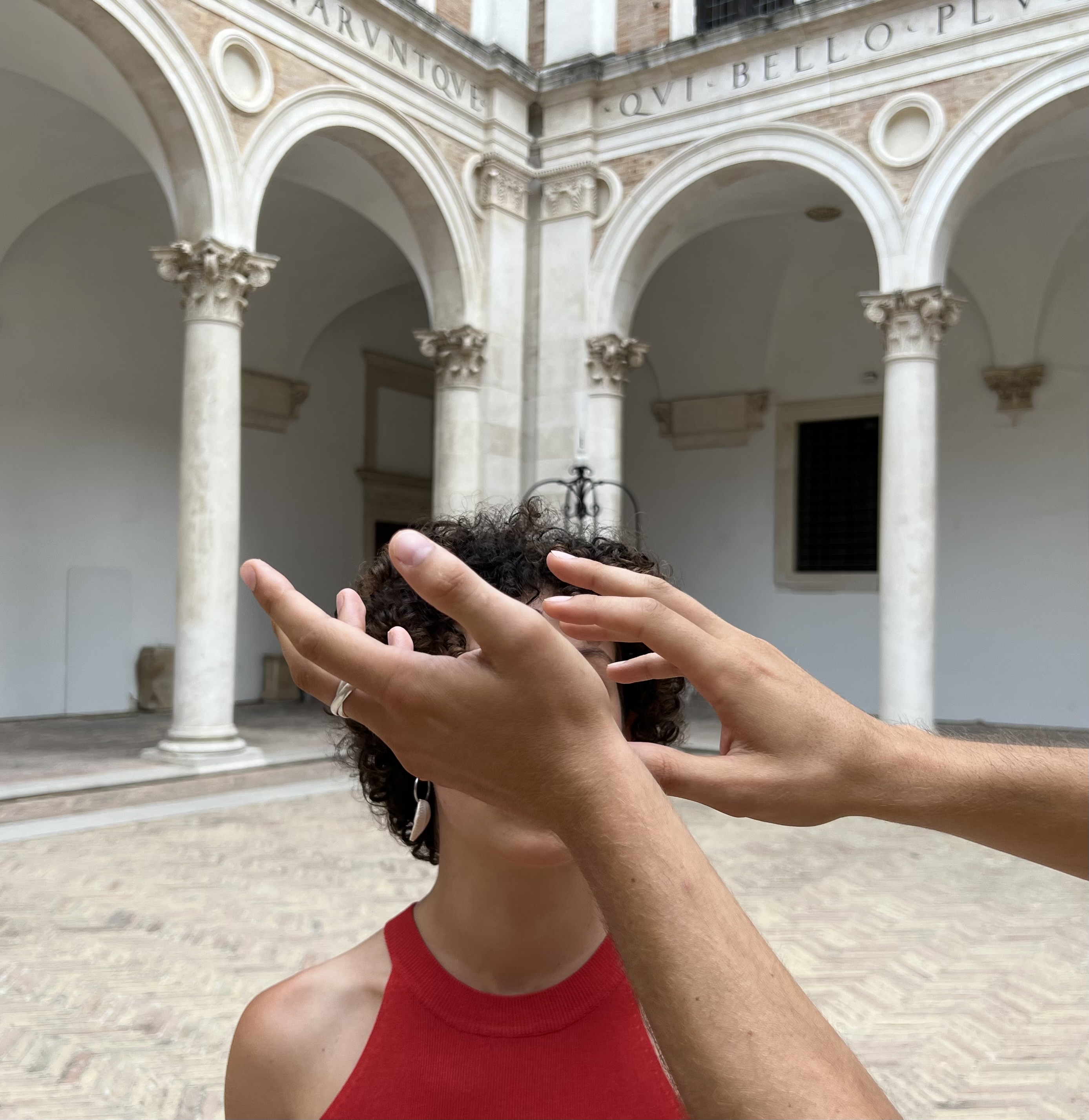 Risalendo in superficie ci disponiamo all’aperto attorno al colonnato del Cortile d’Onore del magnifico complesso architettonico rinascimentale. Qui, nella luce naturale del calar della sera, il violoncellista Daniele Roccato disposto su un lato del quadrato, e quattro danzatrici al centro, danno il via a un susseguirsi di semplici azioni coreografiche riprese, trasmesse, moltiplicate e ampliate da un insieme di persone che avanzano da sole, a coppie, in gruppi, lentamente avanti e indietro, muovendosi con brevi accelerazioni, affollando o lasciando vuoto quello spazio. Sono come un unico respiro amplificato nel gesto dei corpi messi in ascolto del loro stesso ritmo interno ricercando, insieme a quello degli altri, uno “sguardo tattile” che richiami una vicinanza, un contatto vitale. Si accompagnano, si sorreggono, protendono le braccia in avanti e in alto, flettono appena le gambe con lievi cedimenti, intrecciano mani, avanzano carponi, si stendono a terra, corrono in cerchio, si riposizionano in pose prospettiche, scultoree e pittoriche, che ricalcano le opere dei grandi maestri ospitate nelle sale.