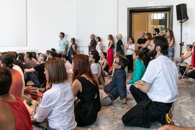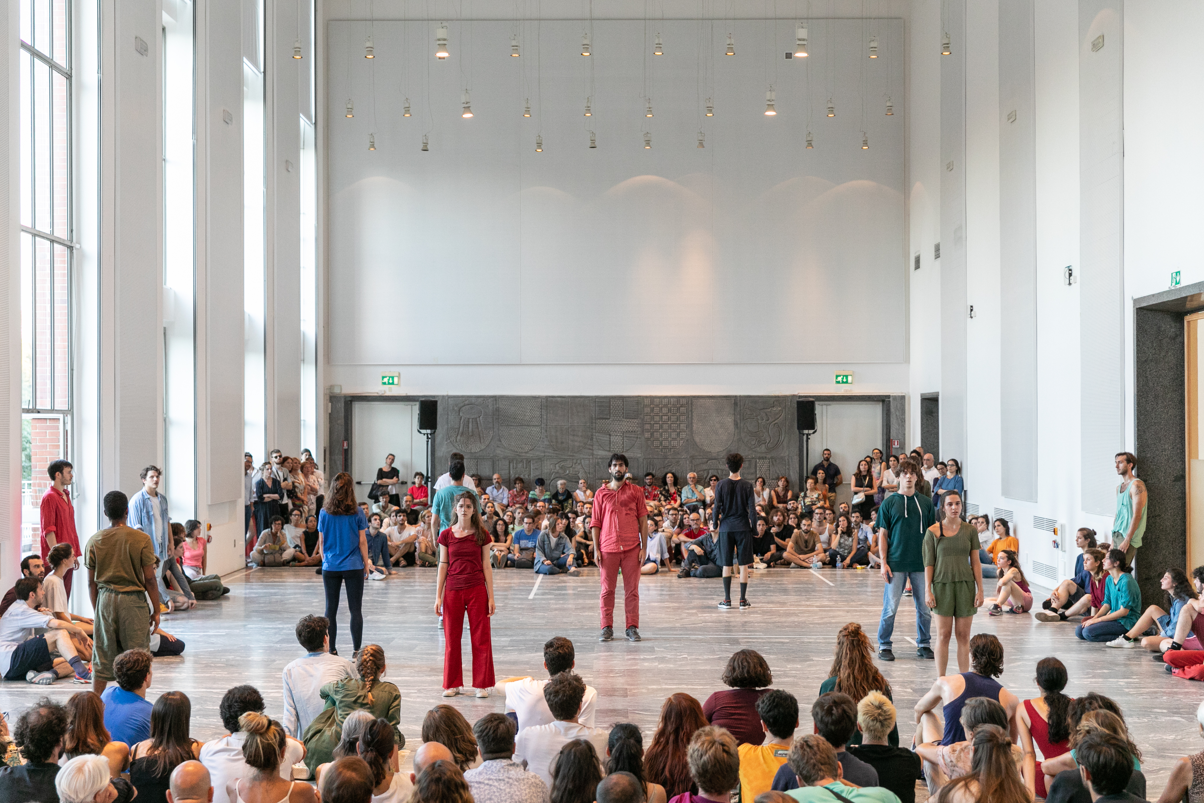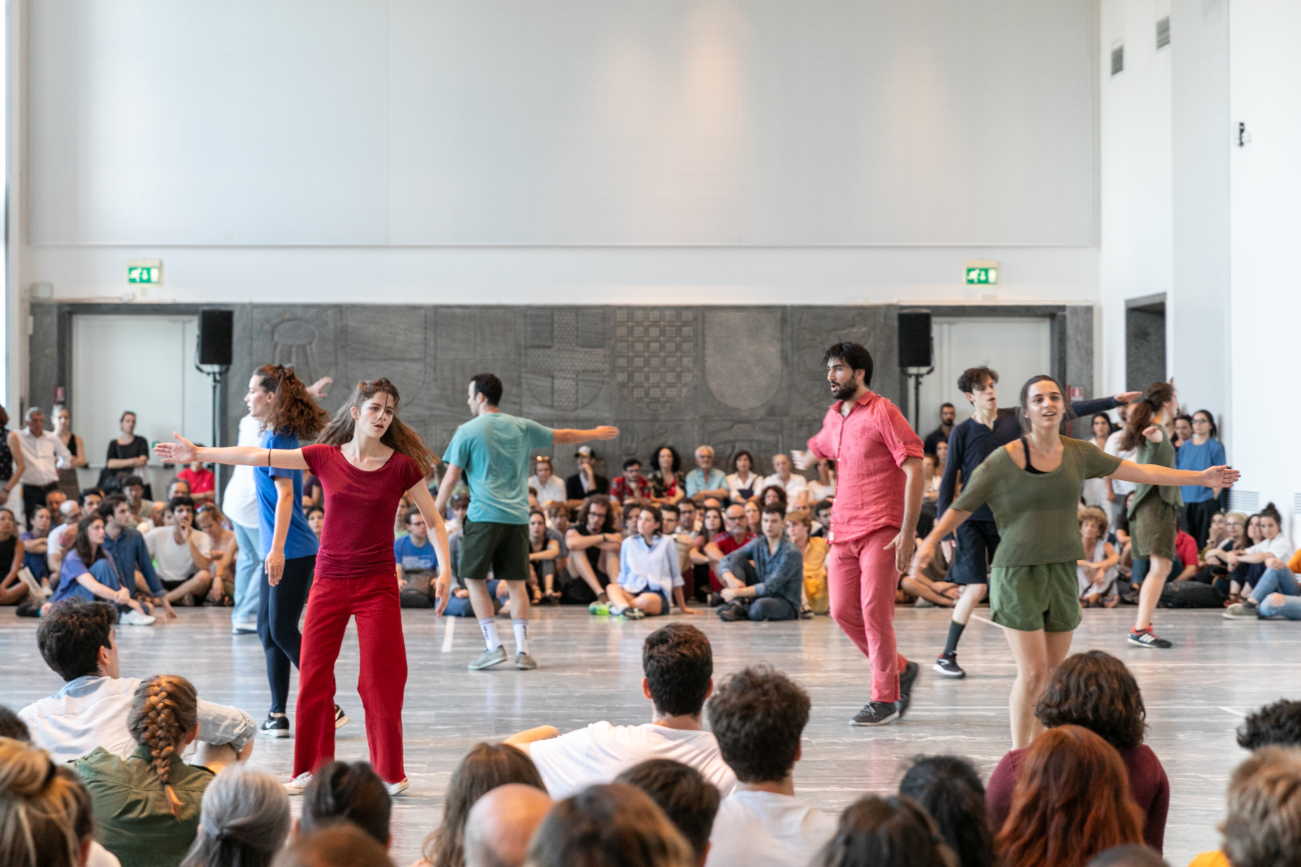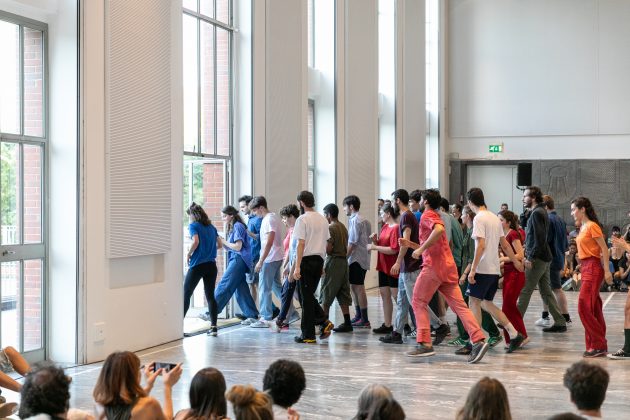 Il pubblico è disposto alle due estremità di un gremito Salone d’Onore al primo piano del Palazzo di Muzio, sede della Triennale di Milano. La musica sancisce l’inizio della performance e una marea di ragazzi inizia a incamminarsi sulla terrazza, entrando piano piano dalla portafinestra aperta. Una volta entrata, questa coda di persone inizia a muoversi in cerchio, camminando, correndo, quindi danzando e girando su se stessi, infine fermandosi, in una rincorsa alla ricerca del sé, quasi senza fine.