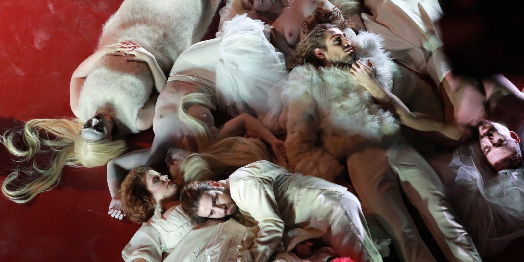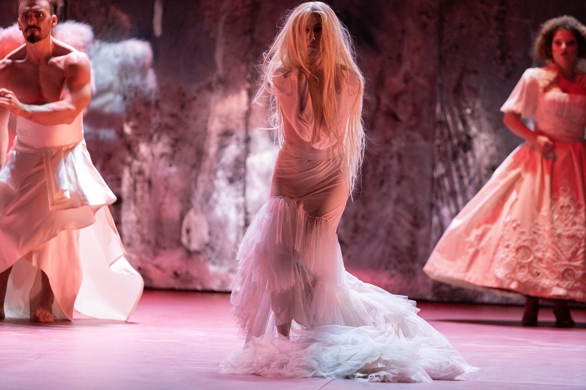 Nel fascinoso spettacolo di Lattuada, coreografa e regista attiva in Francia, la sua impronta è subito all’inizio con due danzatrici contorsioniste – propaggini di Carmen che ritroviamo in altre sequenze, e che Lattuada definisce «Una trinità corporea e spirituale» -, avviluppate a terra in torsioni che inarcano i loro corpi fino a formare un cerchio. Quel vuoto che si crea al centro è l’ingresso negli inferi di un destino già segnato, reso esplicito nella frase dantesca “Lasciate ogne speranza voi ch’entrate”, impressa in alto. Sulla nuda scena solo una larga parete specchiante e maculata, che di apre centralmente a espellere e risucchiare i personaggi concepiti come entità legate l’uno all’altro.