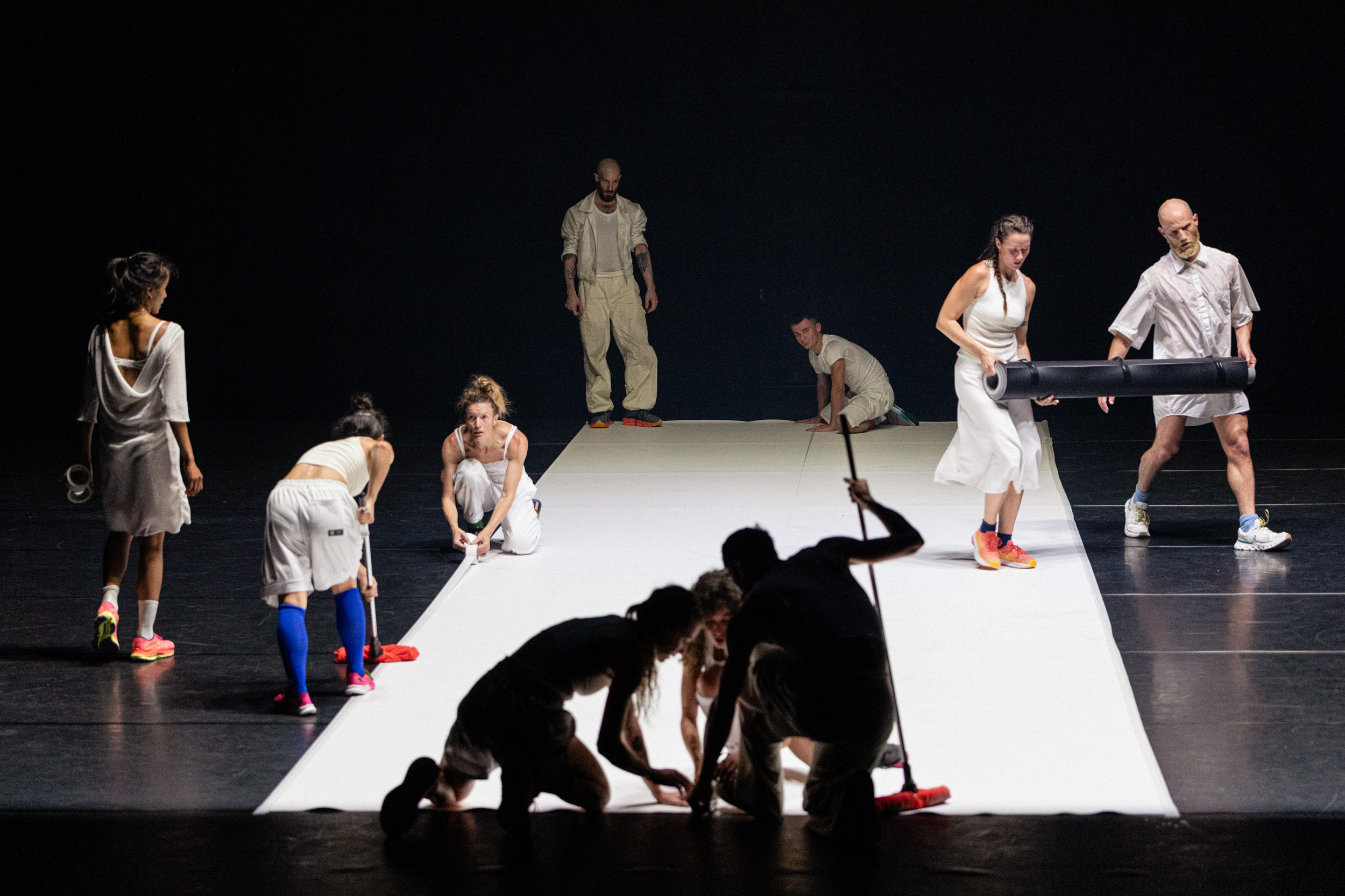 L’approccio in libertà del movimento degli undici danzatori, genera intrecci complessi, fluidi, connessioni continue, corse frenetiche, rotolamenti e sviluppi improvvisi a partire dall’assolo iniziale che da fermo prende lentamente vita, e dal progressivo séguito sempre più corale, muovendosi tutti e interagendo sul progressivo stendere e incollare a terra diverse strisce di moquette bianca srotolate a vista e via via unite durante lo spettacolo, fino a formare un vasto e unico tappeto di danza, spazio luminoso della convivenza umana.