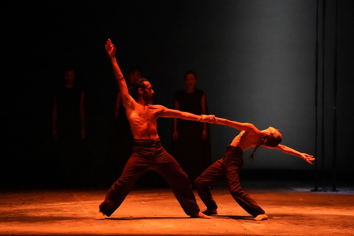 Bagnati qua e là da fasci di luce nella quasi costante penombra, i tre danzatori – Daniele Saul Ardillo, e le due Marie evangeliche Martina Forioso e Ivana Mastroviti – spaziano sull’ampia scena formando molteplici Deposizioni e Pietà pittoriche in movimento: tra prese e trascinamenti, abbracci e ripetuti abbandoni, spasimi e addii rinviati, fughe solitarie per ricercare un luogo di intimità e rinnovate composizioni del terzetto. Nel contatto con le liane elastiche che costellano la scena (set e luci di Fabiana Piccioli), i corpi tesi, imprigionati o respinti, liberi o avviluppati tra respiri ed esalazioni, vibrano con incisiva gestualità prendendo forme di umana purezza sulla struggente partitura musicale di Arvo Pärt.