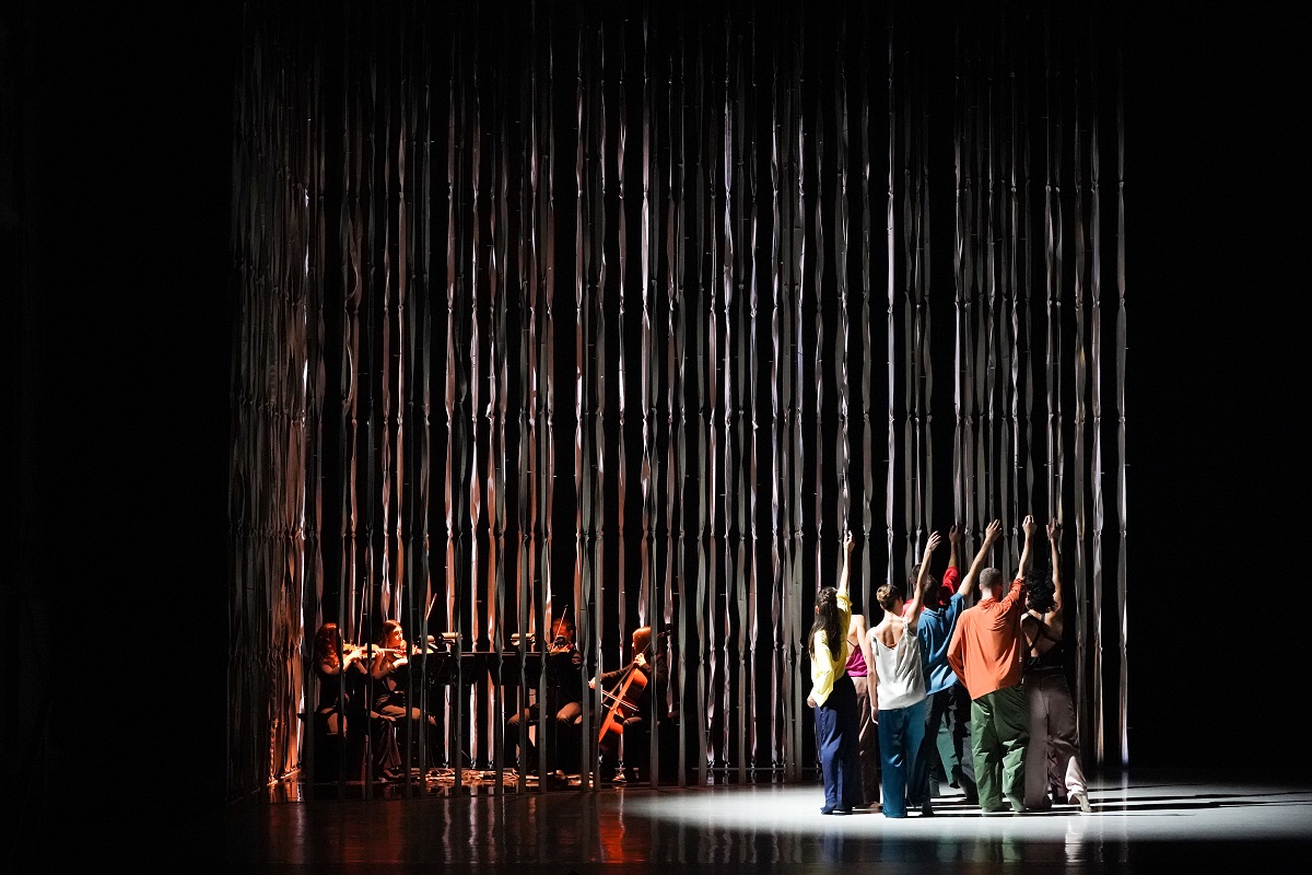 Più solare e gioiosa la coreografia di “With Drooping Wings” della canadese Danièle Desnoyers, creata sull’inedita partitura barocca “An English Suite” di Henry Purcell rielaborata dal compositore italiano Federico Gon, e “sporcata” da un breve pezzo elettronico di Ben Shemie. Il quartetto d’archi confinato dentro la gabbia triangolare di corde elastiche, dialoga con gli otto danzatori dai costumi colorati che ricercano sintonie e disarmonie fisiche nella fluidità della loro danza con la musica.