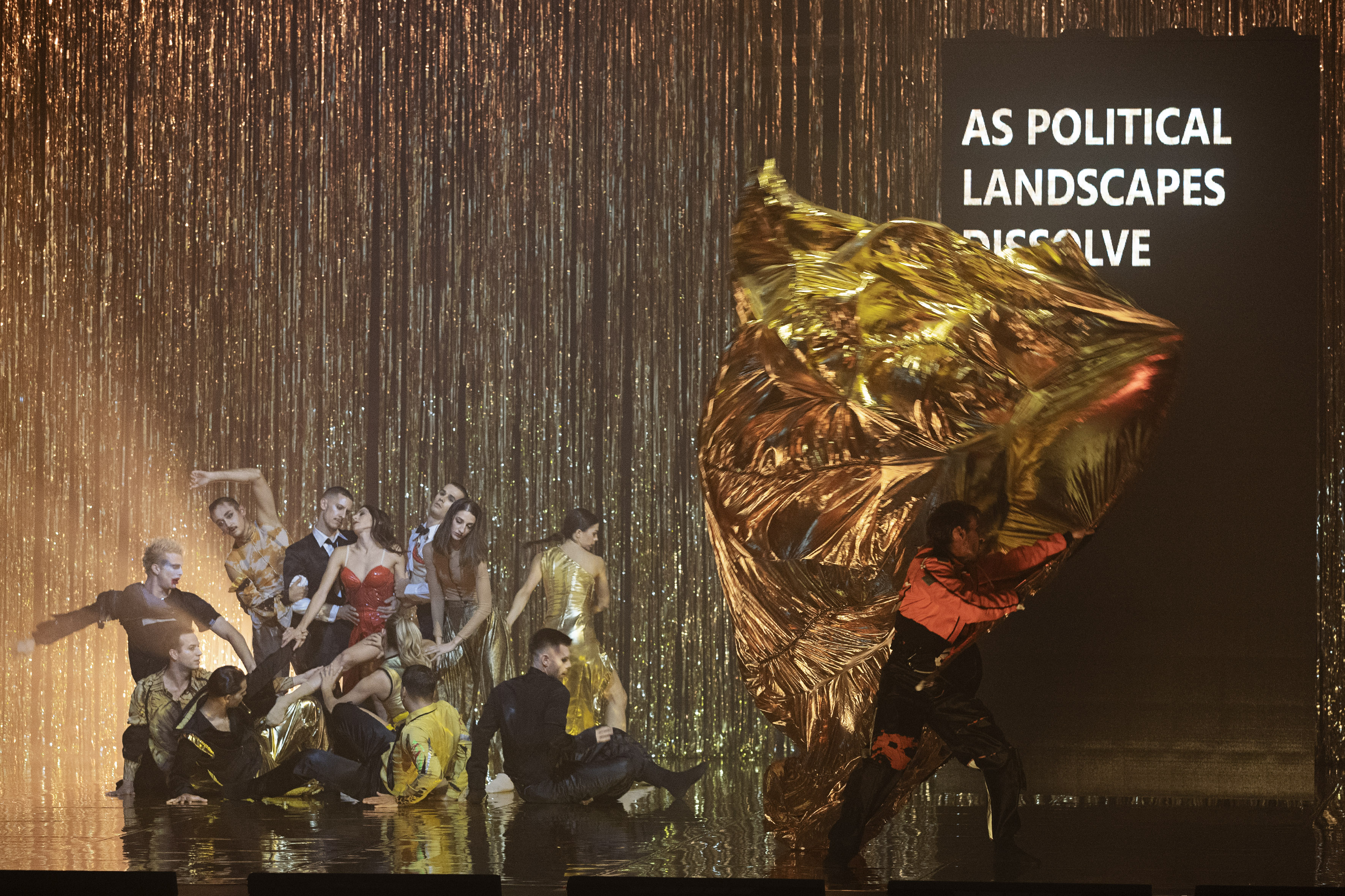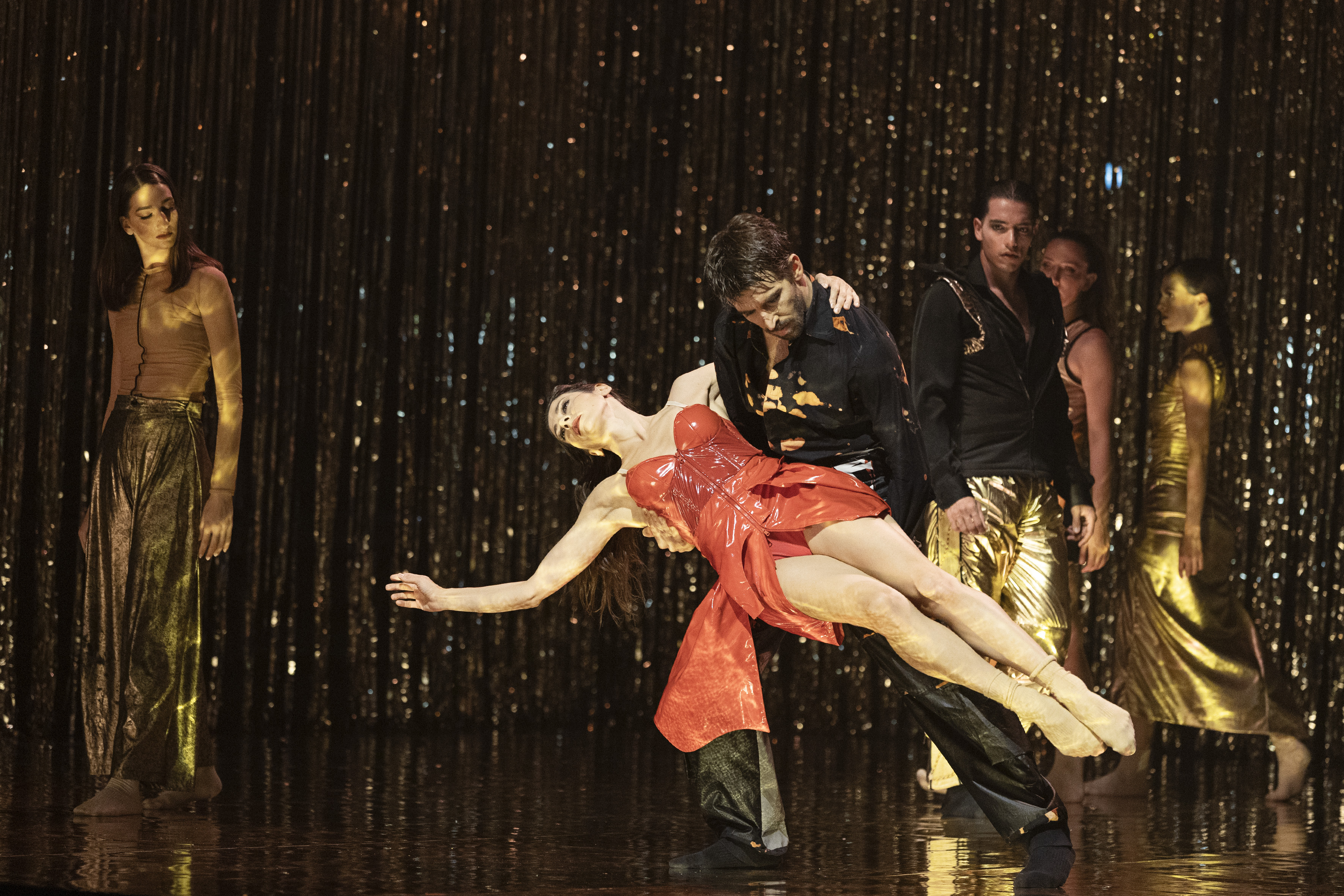 In una commistione di arte visiva e stili coreografici – dal classico al contemporaneo al teatrodanza, dal barocco al musical alla street-dance – che si intrecciano e si interscambiano, il mix è anche musicale: dal sound elettronico che remixa l’aria Addio del passato dalla Traviata di Verdi, a Bizet, a canzoni greche, a brani rock e jazz degli anni ’60 e ’70 come la hit Hotel California degli Eagles, della quale scorre il testo che parla di un luogo attraente ma anche edonistico e auto-distruttivo: “Questo potrebbe essere il Paradiso o l’Inferno”, è una delle frasi della canzone; e un’altra “Alcuni ballano per ricordare, altri per dimenticare”, parole che racchiudono il mondo rappresentato dall’iconoclasta Rigos in questo spettacolo da lui stesso definito “pop metafisico”. Che esplode letteralmente nel finale.