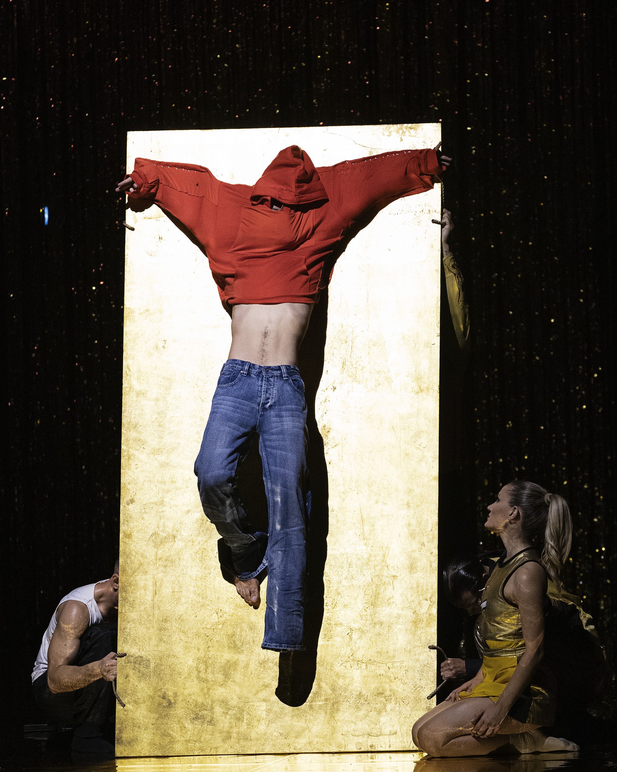 Dentro una scatola scenica delimitata da un tendaggio dorato e da uno schermo in verticale con scritte e immagini digitali, si susseguono scene e azioni sempre diverse con oggetti – palme, un pupazzo dinosauro che interferisce, una crocifissione, un mantello dorato, e costumi delle più varie fogge – che mutano e si aggiungono a supporto della frenesia delle danze prevalentemente corali, che eleggono, a turno, assoli, coppie, gruppi interscambiabili, tra ironia e sensualità, passi di tango, baci appassionati, scontri, canti e risa, per riflettere sull’amore, sulla fede, sull’arte, sull’esistenza, sul passato e sul futuro.