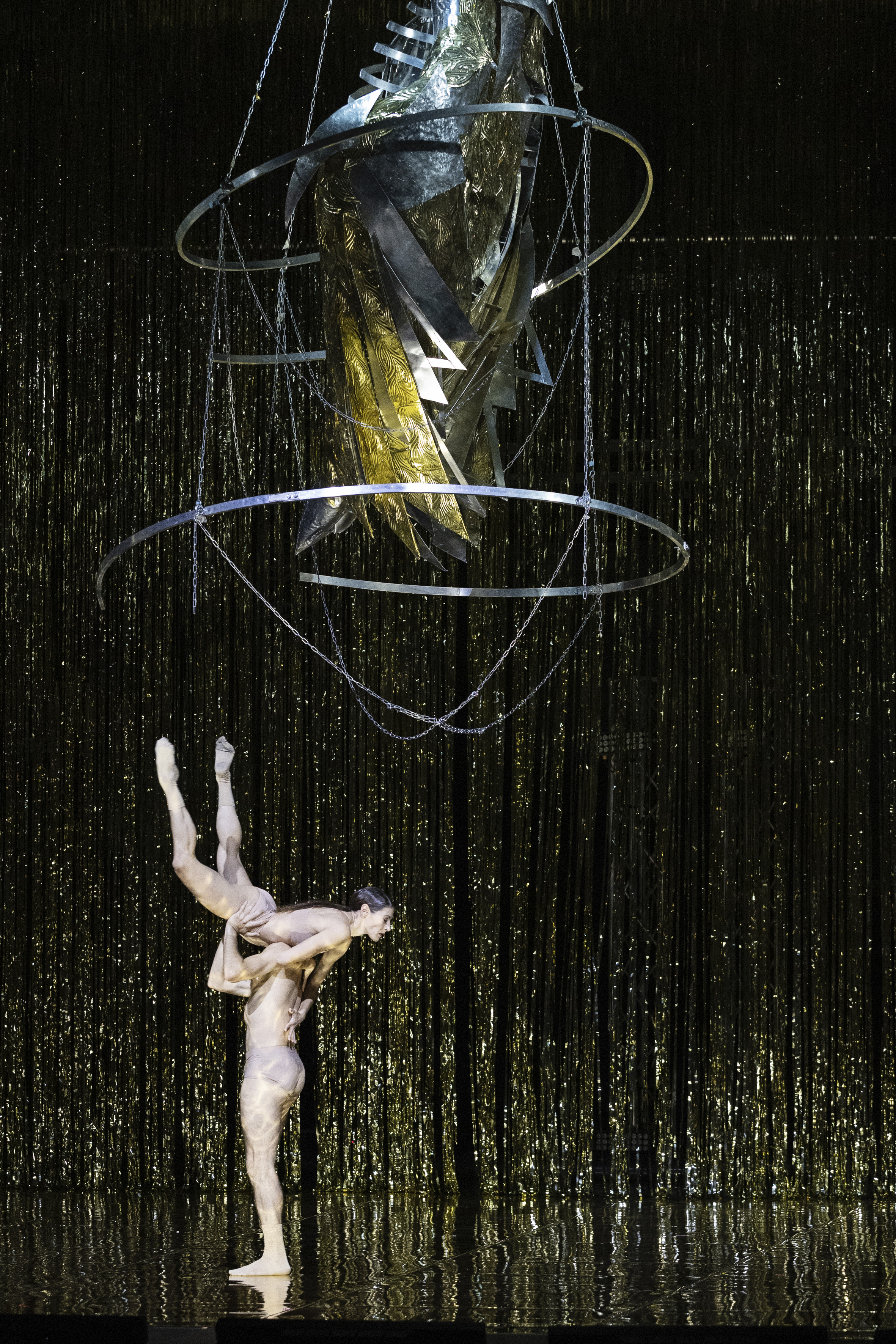 Dopo l’enorme scultura (dell’artista Petros Touloudis) scesa dall’alto e sospesa – raffigurante la carcassa di un uccello dalle ali spezzate, ma trasformate in un cuore -, e la danza struggente di una coppia sotto quel battito, detona un’assordante musica techno con gli strepitosi danzatori, dai fumettistici costumi policromi, che ballano fino allo stordimento lasciando in piedi un solo performer il quale, coprendosi come un Adamo sorpreso nudo, smarrito, in quell’Eden caotico, osservato dal gruppo vicino a lui, sembra interrogarci con le domande di Rigos: “dove siamo adesso? cosa vediamo intorno a noi? a cosa apparteniamo e cosa reclamiamo? cosa è rimasto di vero?”. Uno spettacolo che brucia energia, rompe schemi, e lascia tracce nell’immaginario del nostro tempo frenetico.