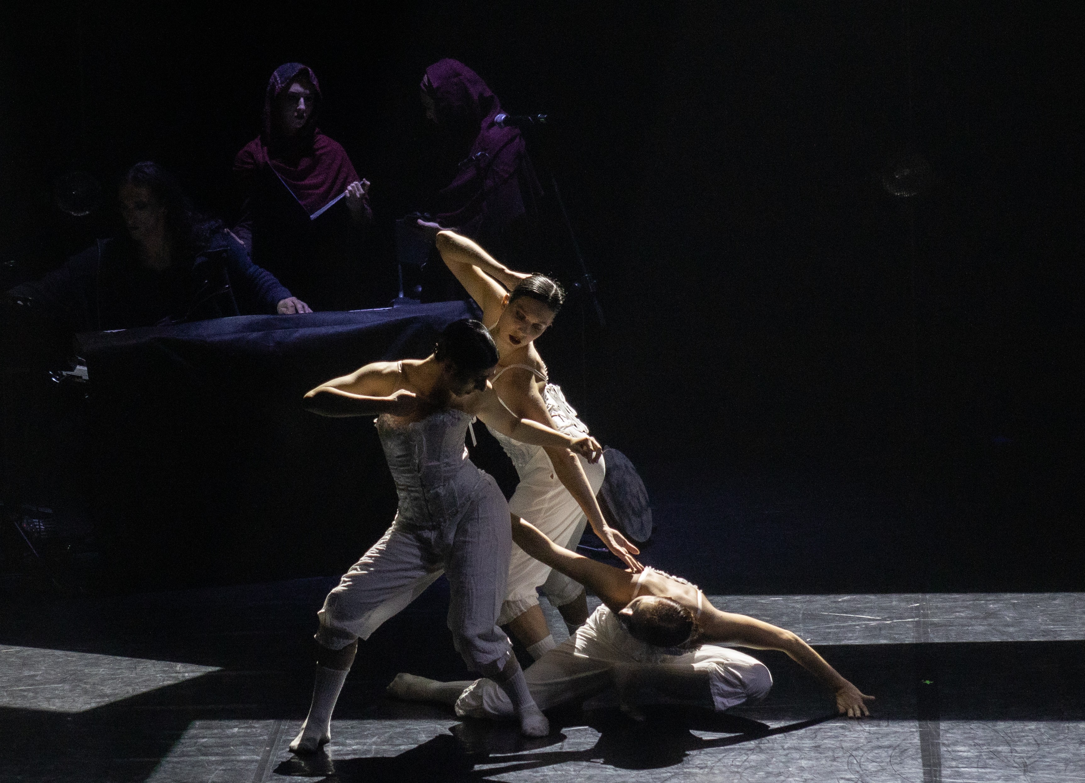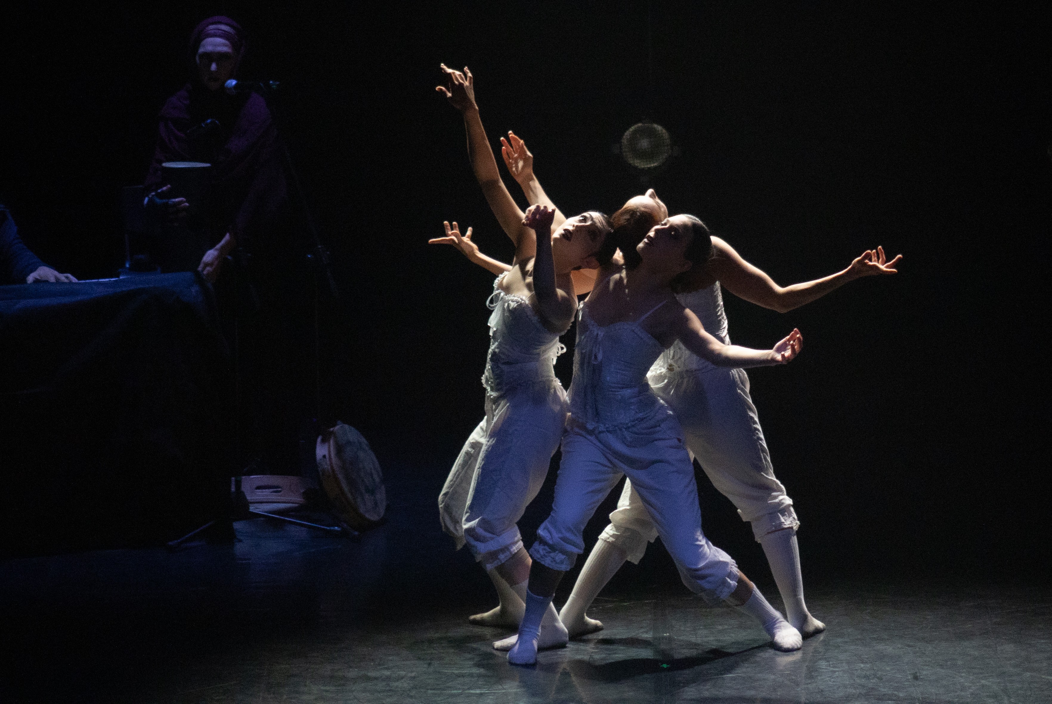 Sulla partitura musicale live di Francesco Dracca – tastiere, percussioni, effetti acustici -, accompagnata dalla voce della stessa coreografa, si compone un paesaggio sonoro che, subito in apertura di spettacolo, evoca deserti, spazi ancestrali, quasi un’origine del mondo, con tre danzatrici a terra, vestite di bianco, illuminate una alla volta dentro un cono di luce.