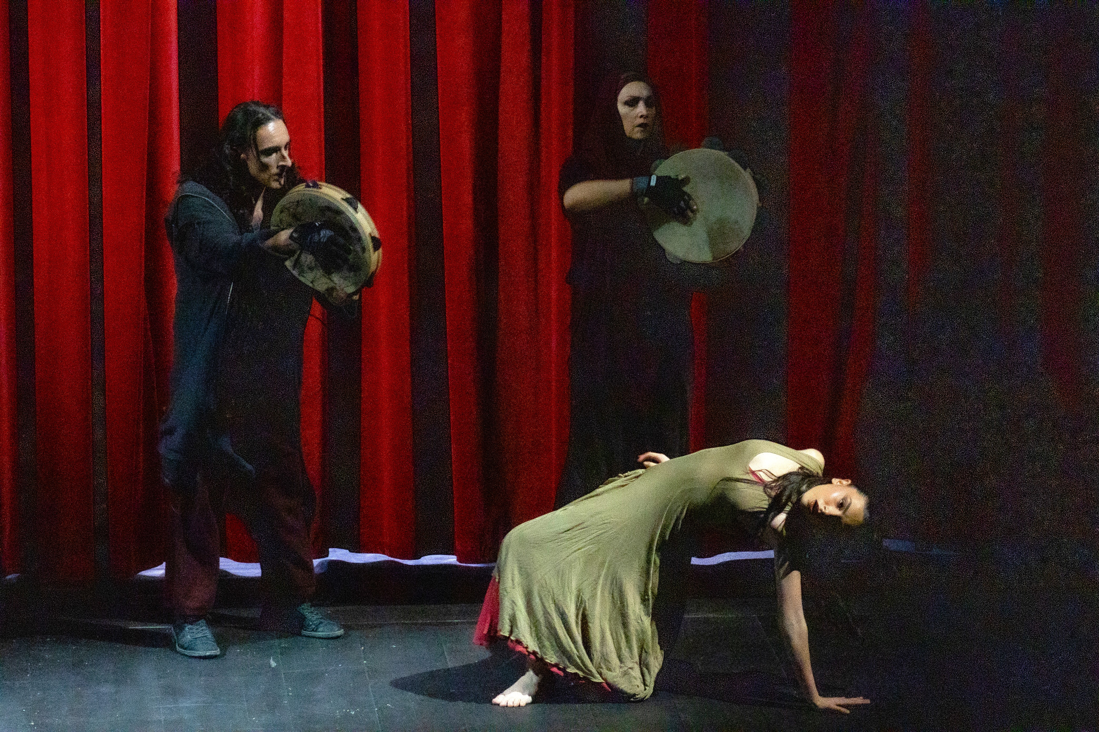 Un risveglio, il loro, una nascita, che muove dall’articolazione degli arti tutti, da inarcamenti del busto, da posture in tensione a terra e in posizione eretta, da scatti argillosi, da sinuosità serpentine e rotolamenti avvolgenti. Sono emanazioni di figure animali e mitologiche, e incarnano la forza femminile, corpi come luogo di resistenza e conoscenza. Al ritrovarsi in triade, intrecciandosi in movimenti allertati a comporre un’unità, nel dipanarsi dei gesti di una danza fluida e rituale, trova eco il respiro del tempo, della memoria dei corpi che l’abbagliare pulsante di fari frontali rivolti in platea, sembra indicare la metamorfosi in atto, la ferita che si fa luce. Al chiudersi del sipario l’avanzare percussivo dei tamburelli segue l’irruzione in proscenio di altre due sinuose figure femminili. Sono ancora il ragno sfuggito al controllo umano, che riappare nei campi assolati del Sud, pronto a pungere ancora.