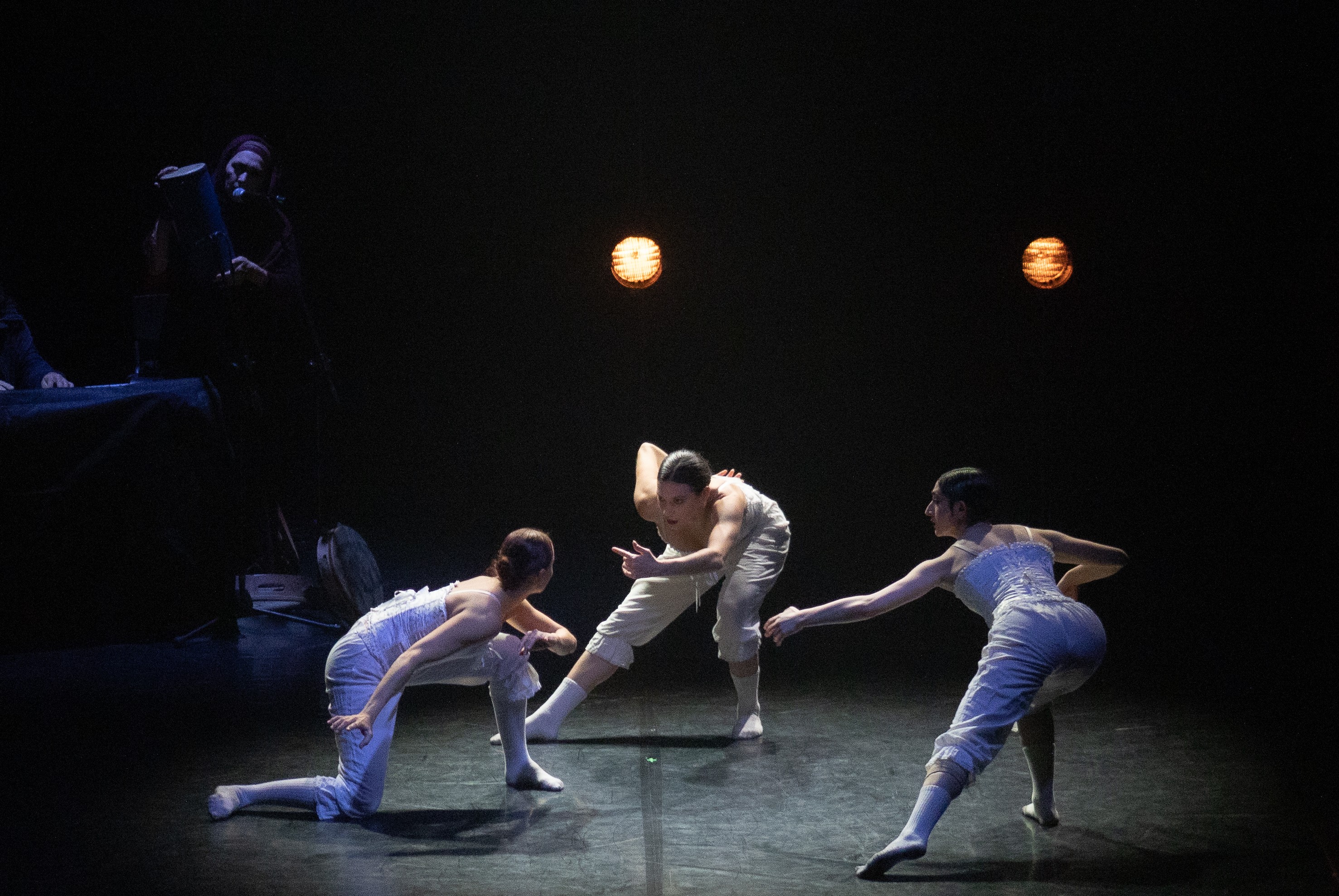 Sulla partitura musicale live di Francesco Dracca – tastiere, percussioni, effetti acustici -, accompagnata dalla voce della stessa coreografa, si compone un paesaggio sonoro che, subito in apertura di spettacolo, evoca deserti, spazi ancestrali, quasi un’origine del mondo, con tre danzatrici a terra, vestite di bianco, illuminate una alla volta dentro un cono di luce.