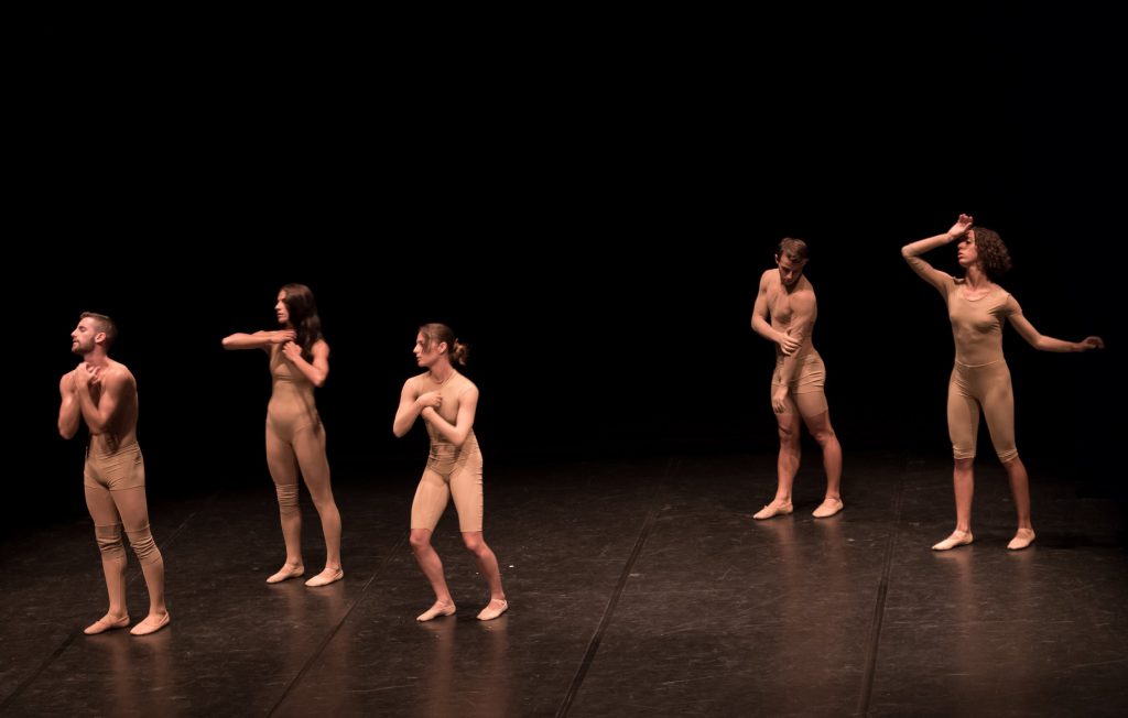 Giselda Ranieri ha lavorato con quattro giovanissimi danzatori del CAP, Corso di Avviamento Professionale del Balletto di Roma firmando un pezzo dal titolo Glitch: here we go again. La coreografa attiva un dispositivo giocoso e ironico, inscenando, come in una chiacchierata tra amici, una serie di piccole sequenze tra i componenti del quartetto che si presentano chi con una piccola chitarra, chi indossando un tutù, chi con una cuffia ascoltando musica. Nel giocare a nasconderla rimbalzandosela, da lì iniziano a trasmettersi anche una serie di gesti, movimenti, parole, dinamiche trasformati in danza. Ciascuno esegue la sua, il proprio racconto, uscendo dal gruppo e ritornandovi. Procedendo coralmente, con un cambio di atmosfera e di musica, rotolando a terra come onde approdano in un altro luogo attivando, nel linguaggio corporeo, balli swing, smorfie facciali, e utilizzo anche della voce finalizzata a emettere suoni, a farsi musicale. Dentro questo sbarazzino meccanismo di trasmissione di movimento dell’uno all’altro, tra stop motion, frammentazione, loop, velocità di esecuzione e ritmo da mantenere richiesto agli interpreti, la coreografia tradisce una irrisolta composizione, con l’effetto più vicino a un lavoro laboratoriale.