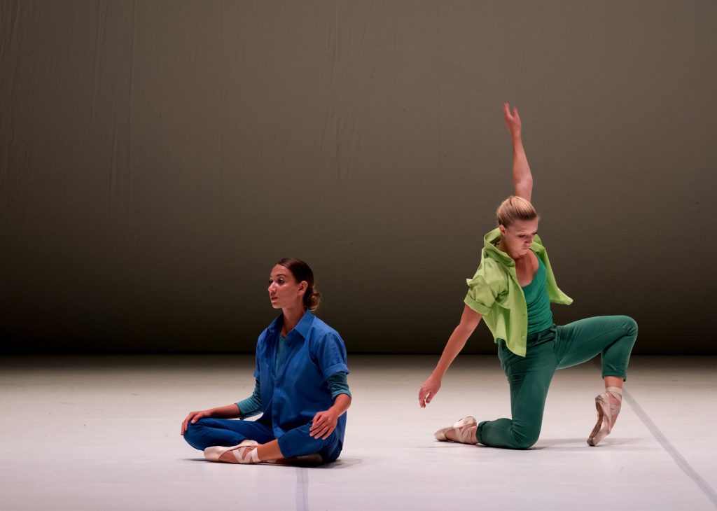 È un piacere per gli occhi e le orecchie, il duetto Stretching one’s arms again (produzione Anghiari Dance Hub/Versiliadanza) di Lucrezia Gabrieli in scena con Sofia Magnani. Serenade di Mozart e Untitled (Blue, Yellow, Green on Red) del pittore Rothko i due riferimenti di una coreografia di linee, di tecnica, e di contenuto, costruita sulla leggerezza e musicalità compositiva dello scambio tra le due danzatrici che giocano con l’equilibrio, il ritmo, la vicinanza e il trascolorare cromatico che le scolpisce in un controluce da silhouette nel finale. Con gesti ampi, veloci, morbidi, svolazzanti come note di una partitura disegnata nell’aria, con attimi di pausa e di silenzio allo spegnersi e riaccendersi della musica, la coppia, dal costume verde e azzurro sfumati, esplora gioiosamente nuove possibilità di movimento usando le classiche scarpette a punta.