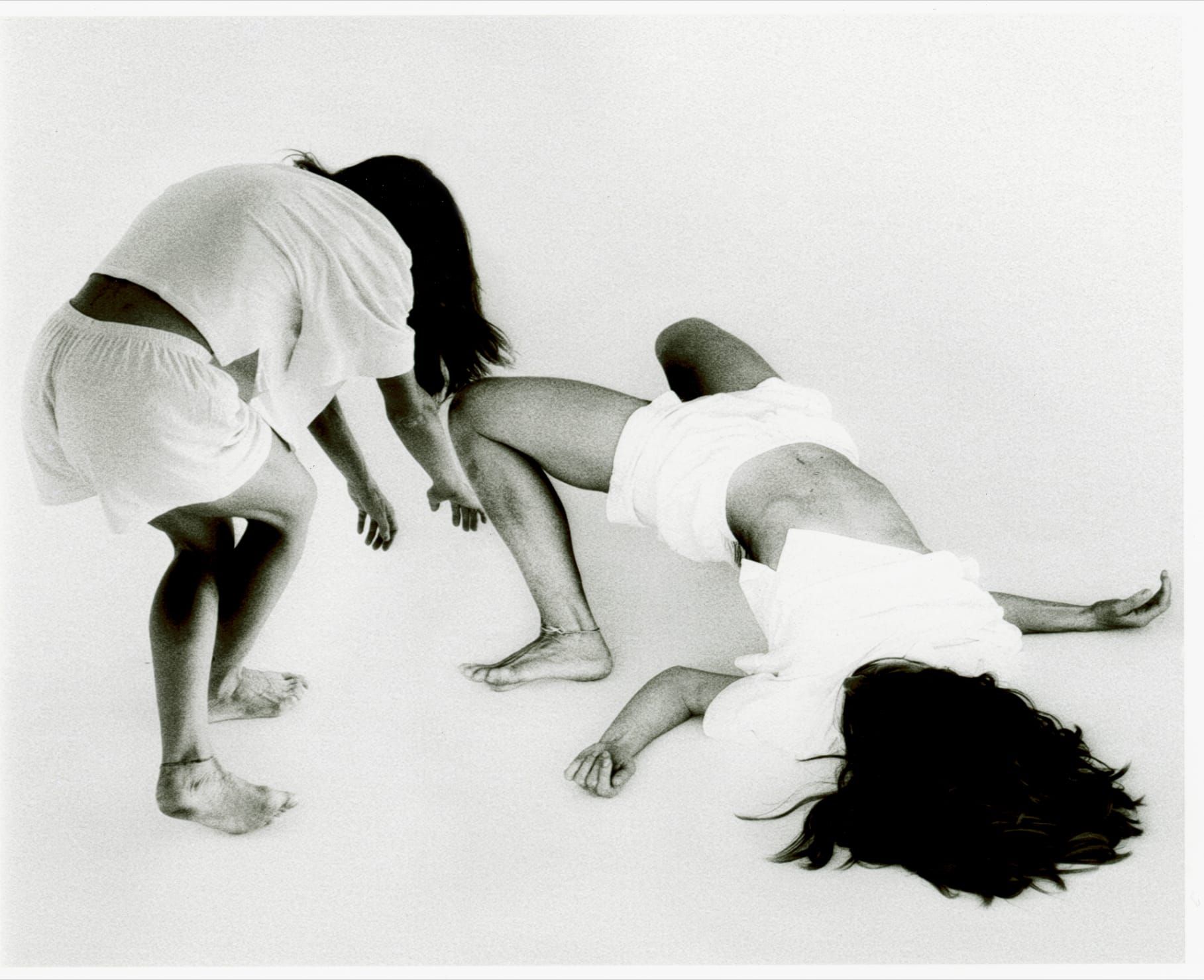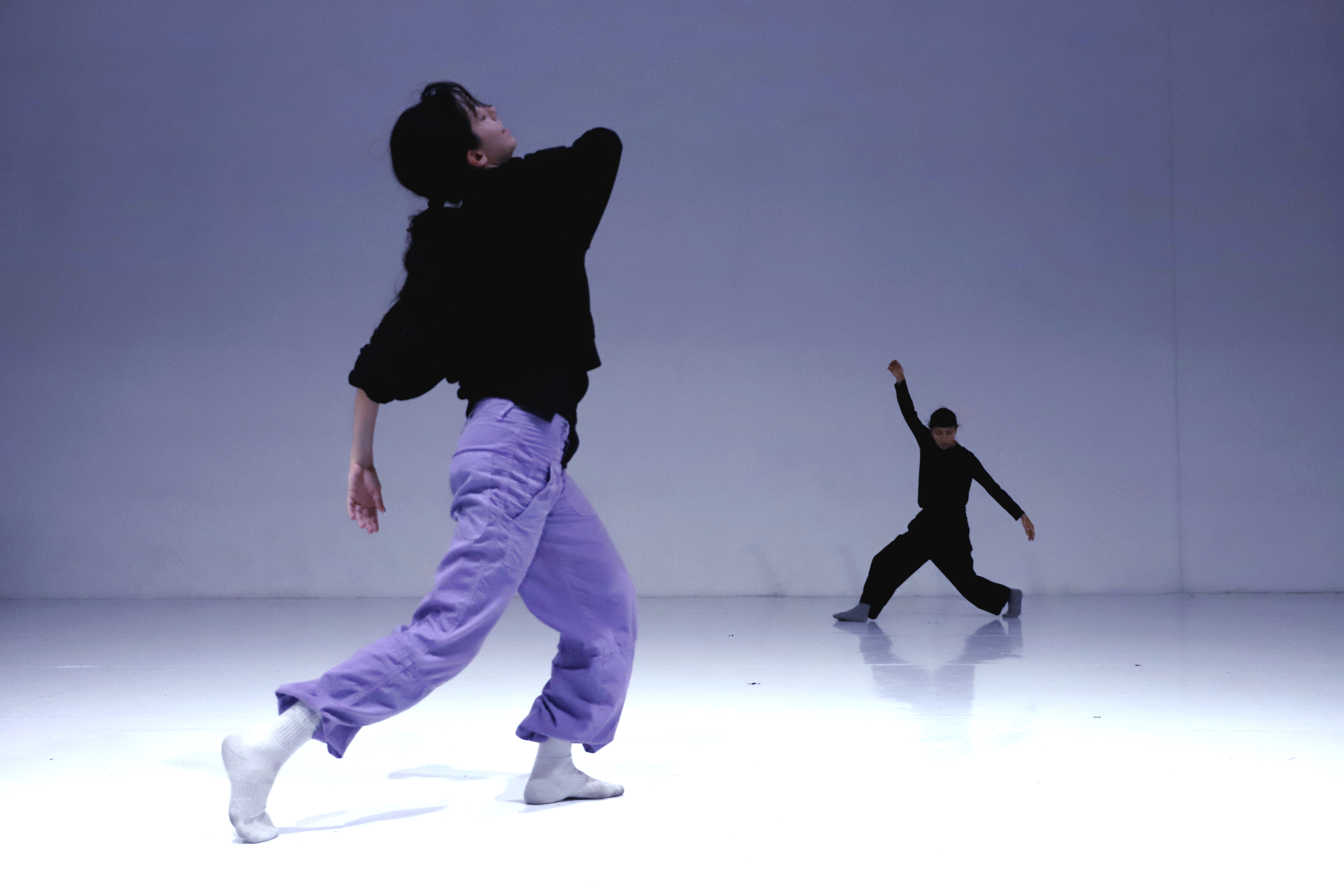 Finché ci trema il cuore di Michael Incarbone è un duetto pulsante e sospeso, intimo e spaziale, sulle musiche originali di Filippo Lilli. Si muovono sulla soglia labile di un orizzonte di luce e ombra le due bravissime danzatrici Erica Bravini e Marina Bertoni, nella linea indefinita di un confine tremulo che cambia e si sposta con il loro fremere dei corpi, tra sospensione e dinamismo, tra distanza e svelamento, segnato da due aste tenute in mano delimitanti traiettorie ed equilibri.