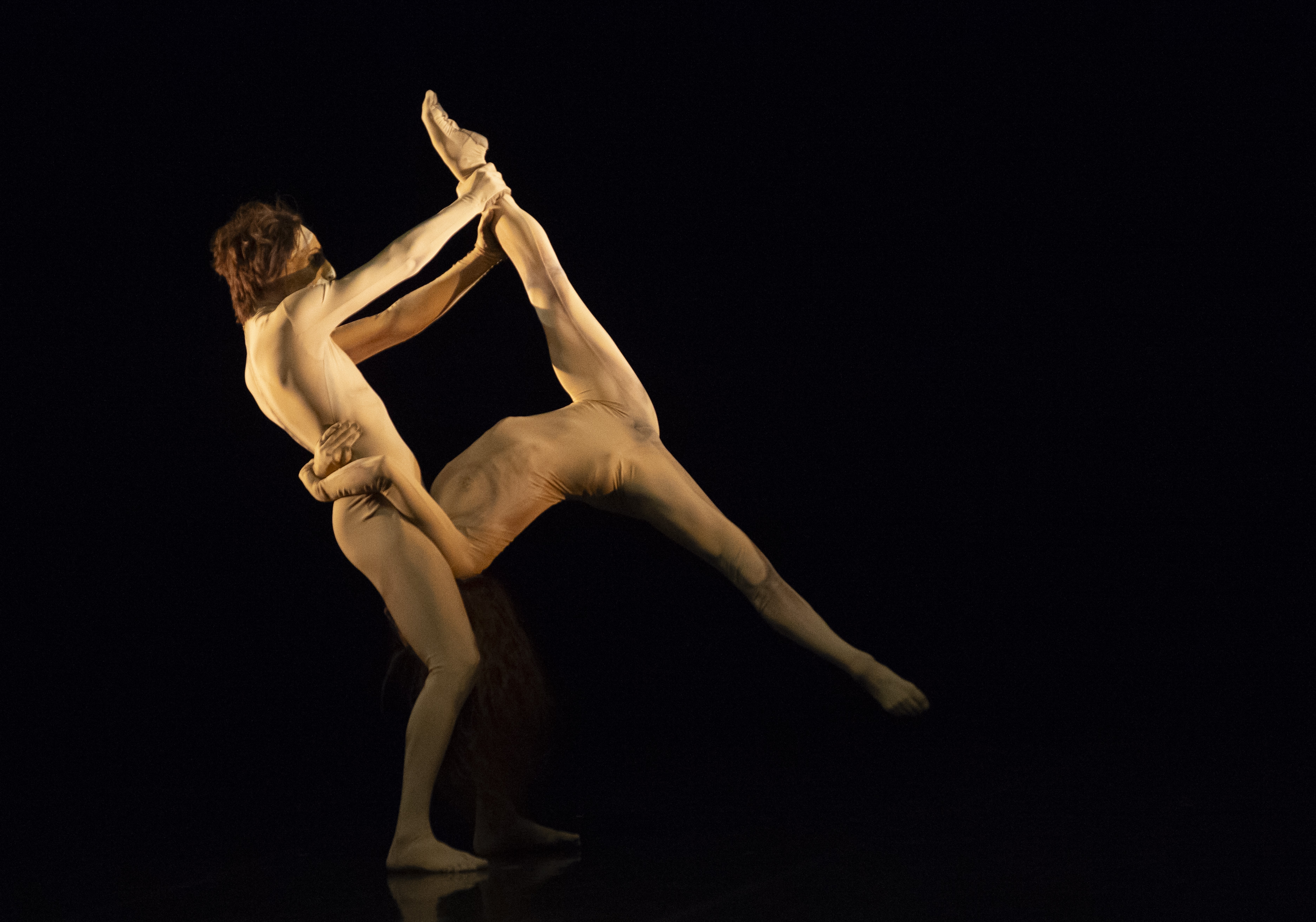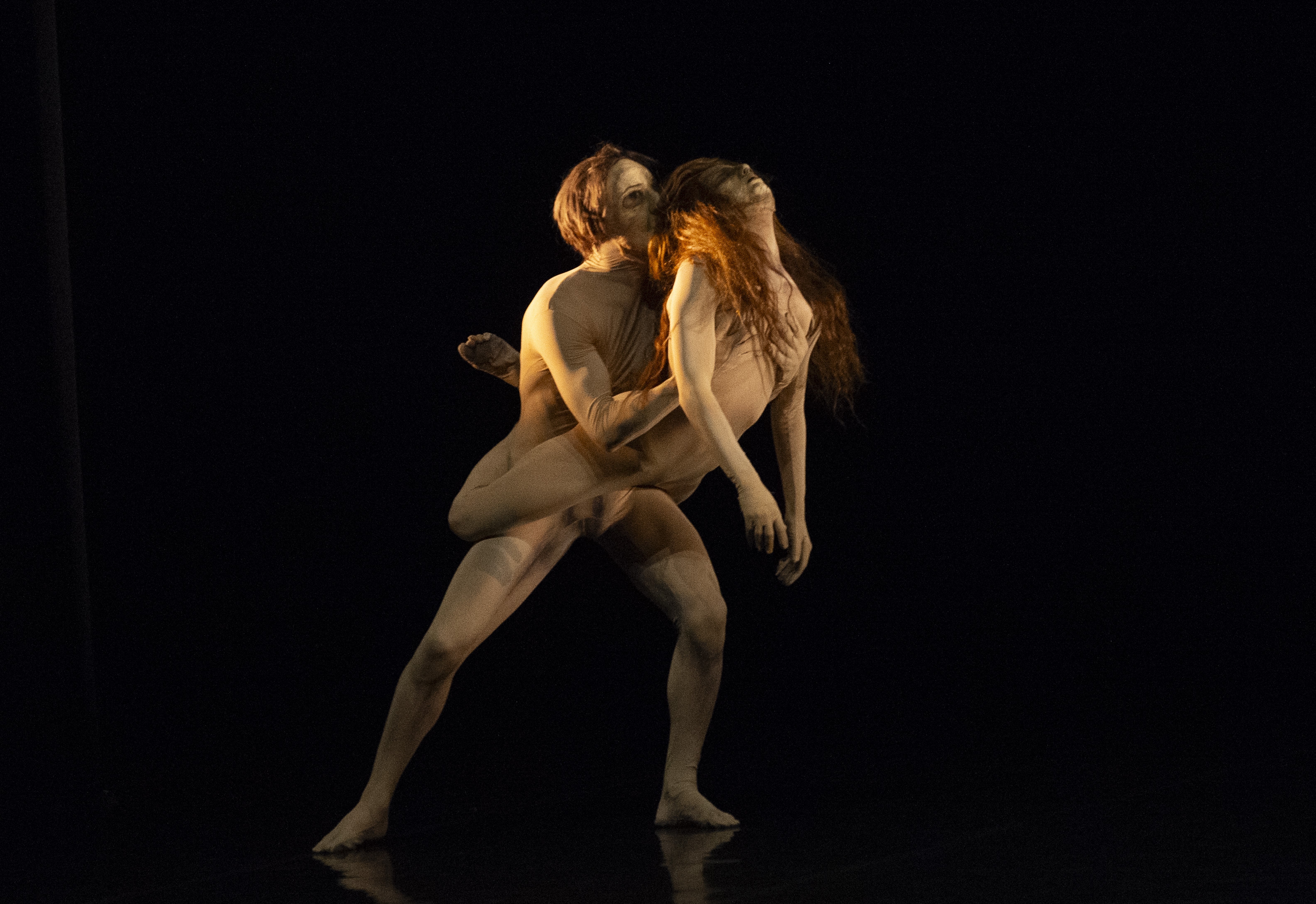 Grosse fugue è stata preceduta da Duo d’Eden, altro titolo di Maguy Marin del 1986, entrato nel repertorio della compagnia emiliana nel 2020. È un folgorante duetto (un estratto del più ampio Eden) dentro la genesi dell’uomo, dell’origine e della fine. E dell’amore. La simbiosi, il rigore esecutivo e l’ardua prova fisica di Emiliana Campo e Nicola Stasi, catturano la tensione dello sguardo immergendoci dentro un mondo primordiale evocato solo dalla danza muscolare dei loro corpi velati da un costume color carne che li rende nudi, col viso mascherato e una lunga chioma. Sono Adamo ed Eva, colti nella nudità del paradiso terrestre; sono i sopravvissuti a un’apocalisse, unici esseri viventi su una terra desolata; sono gli amanti di sempre nel loro frastagliato rapporto di unione.