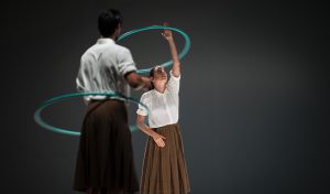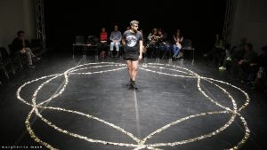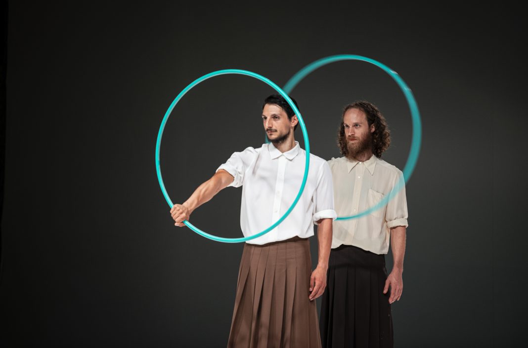 La performance con Collettivo Cinetico Dialogo terzo: in a landscape ha individuato nell’hula hoop l’oggetto poetico dell’azione. I cinque performer entrano in scena lentamente ruotando ciascuno il proprio, all’unisono, poi con tempi sfalsati, opposti. È un vorticare lento, veloce, continuo, inesorabile, contrario, durante il quale si guardano tra loro con lievi spostamenti del viso e del corpo, come a indicare traiettorie nuove, complicità, invisibili geometrie di intese e accordi. Tutto è lieve nei movimenti che scorrono sulla partitura sonora di John Cage, composta – riferisce Sciarroni – per “calmare la mente e aprirla ad influenze divine”, ed eseguita dal vivo dal performer e musicista Stefano Sardi. Il gruppo si ferma per sedersi e osservare un assolo che continua la sua rotazione, poi seguito dagli altri. Cambi di velocità avvengono alzando il cerchio dai fianchi su un braccio, in alto e in basso, sul collo con un colpo dei fianchi, stando in equilibrio su una gamba, distanziandosi e riunendosi in fila indiana, tali da generare ipnotiche sequenze che producono effetti di pianeti in orbita, di fluttuazioni aeree, di evanescenze corporee. Insomma, infinite possibilità del movimento circolare, eseguito sempre con un rigore formale, una nitidezza di esercizio che non è solo controllo tecnico, ma rivela una dimensione di socialità, di contatto non fisico – anche se due di loro, disponendosi a specchio, si toccano con le mani -, ma di intenti, di relazioni umane invisibili, che è rapporto di anime “altre”. Leggere, misteriose, fuori dal tempo e dallo spazio. Pronte a scomparire, per ritrovarsi altrove.