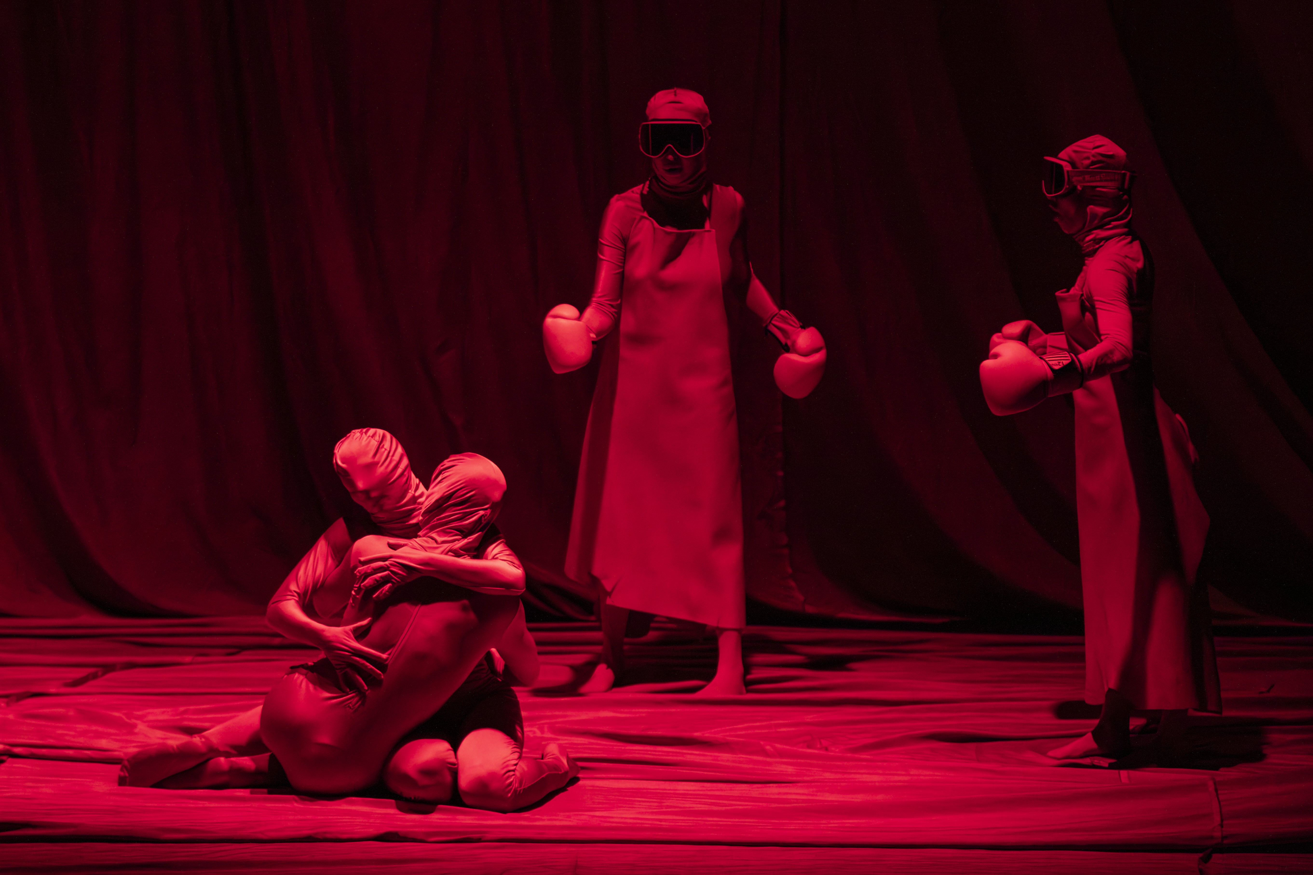Creato nel 2022, ultimo della serie Monument iniziata nel 2014 dalla coreografa e artista multidisciplinare di origine ungherese, attiva tra Berlino, Parigi e Budapest, lo spettacolo è un ammaliante, ipnotico, riverberante viaggio figurativo e immaginifico di corpi in continua trasformazione, dei quali scorgiamo appena il fisico (solo in alcune sequenze, come quella dai costumi dorati, ne vediamo le fattezze), coperti come sono di stravaganti maschere, copricapi, costumi, stoffe, protesi, costantemente (ri)organizzati nello spazio, con una lentezza magnetica di impercettibile gestualità, movimenti e posture.