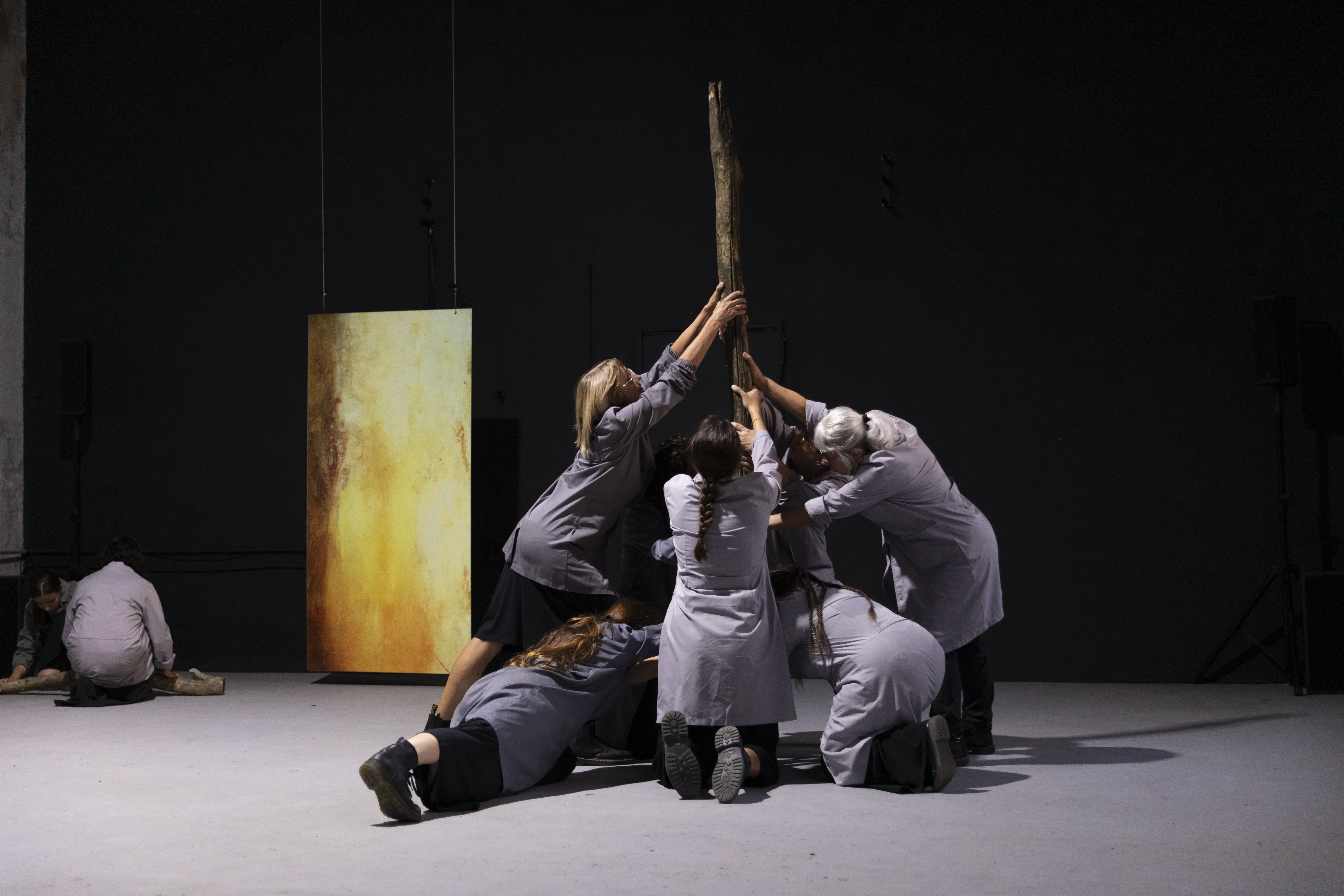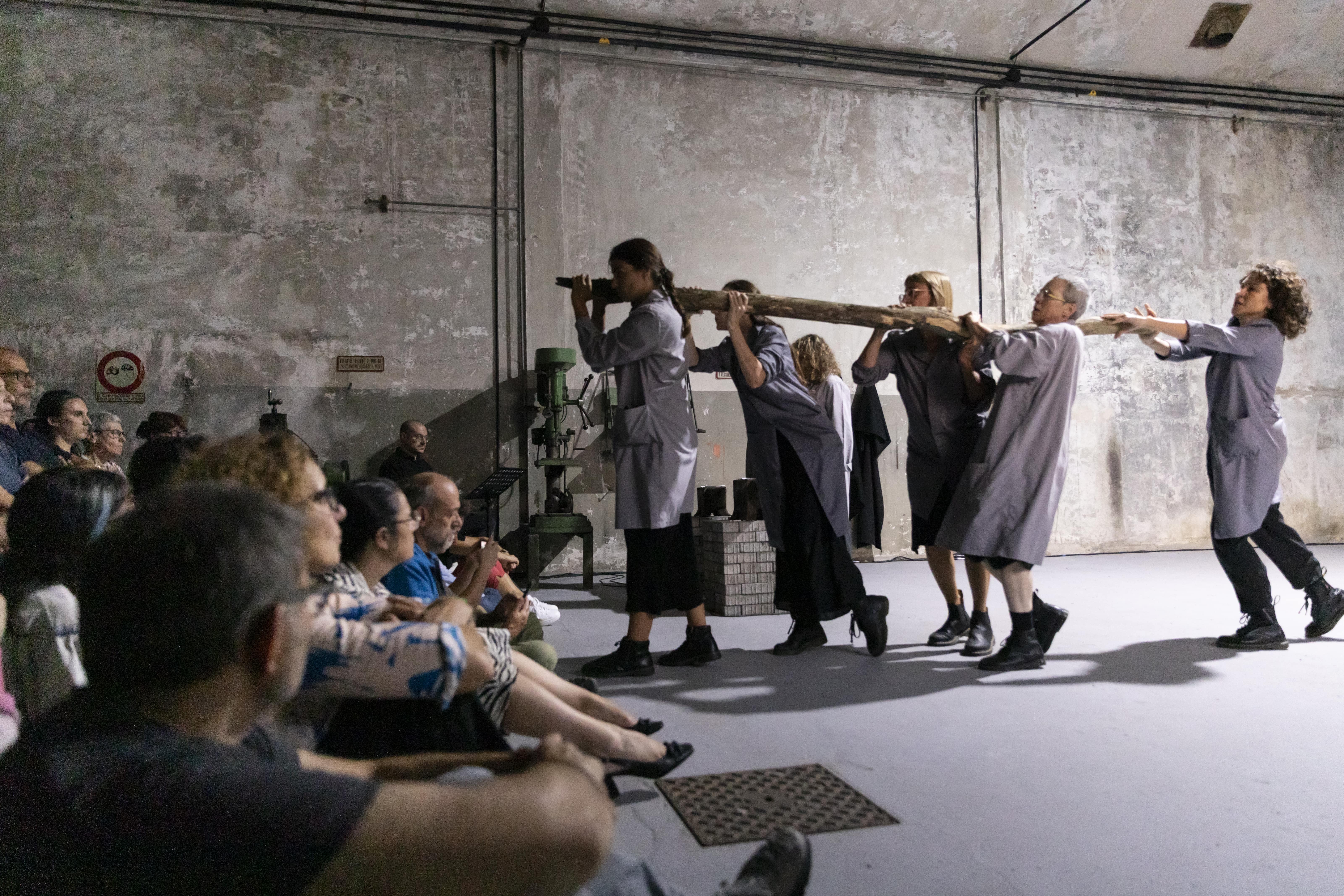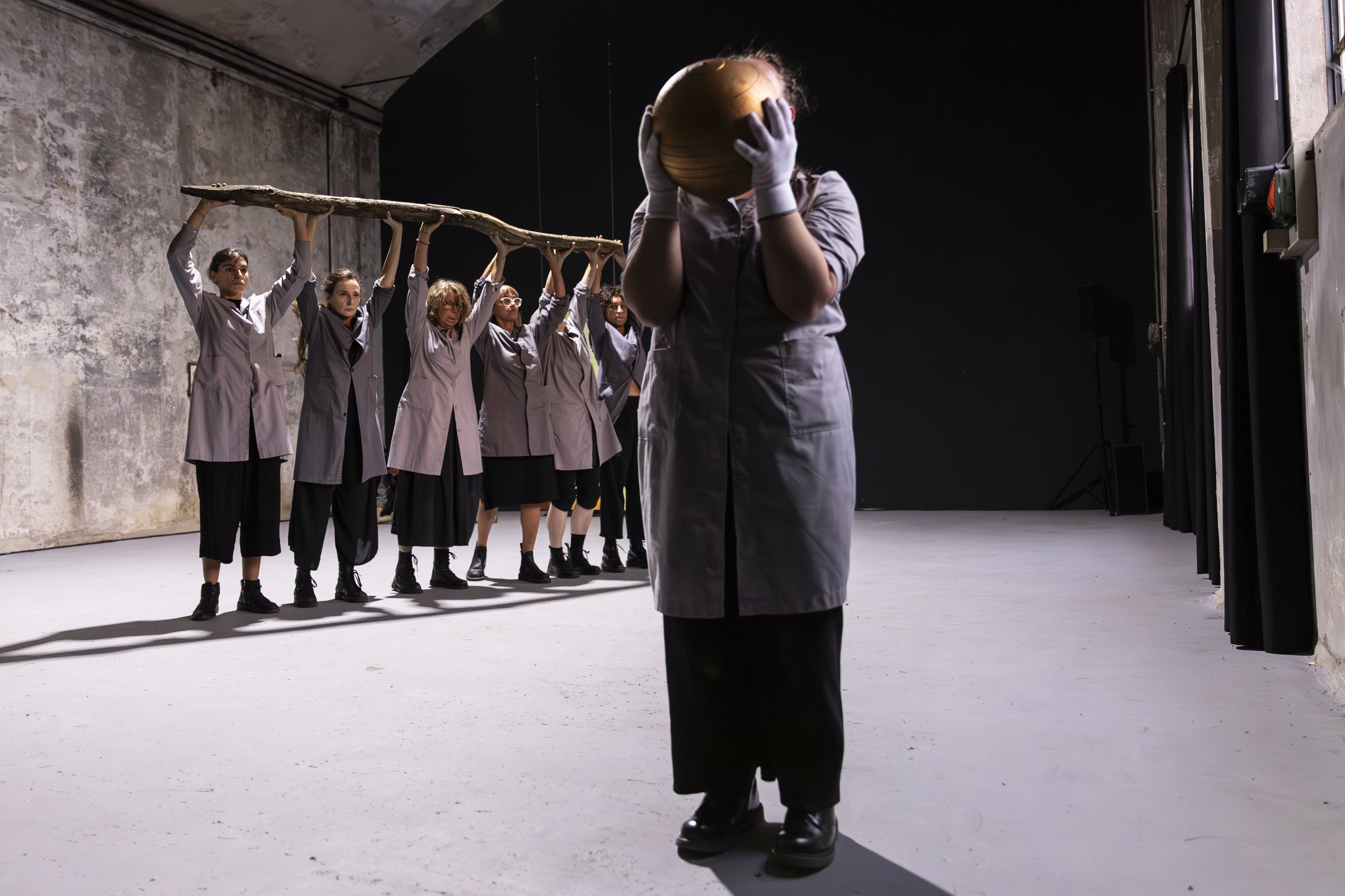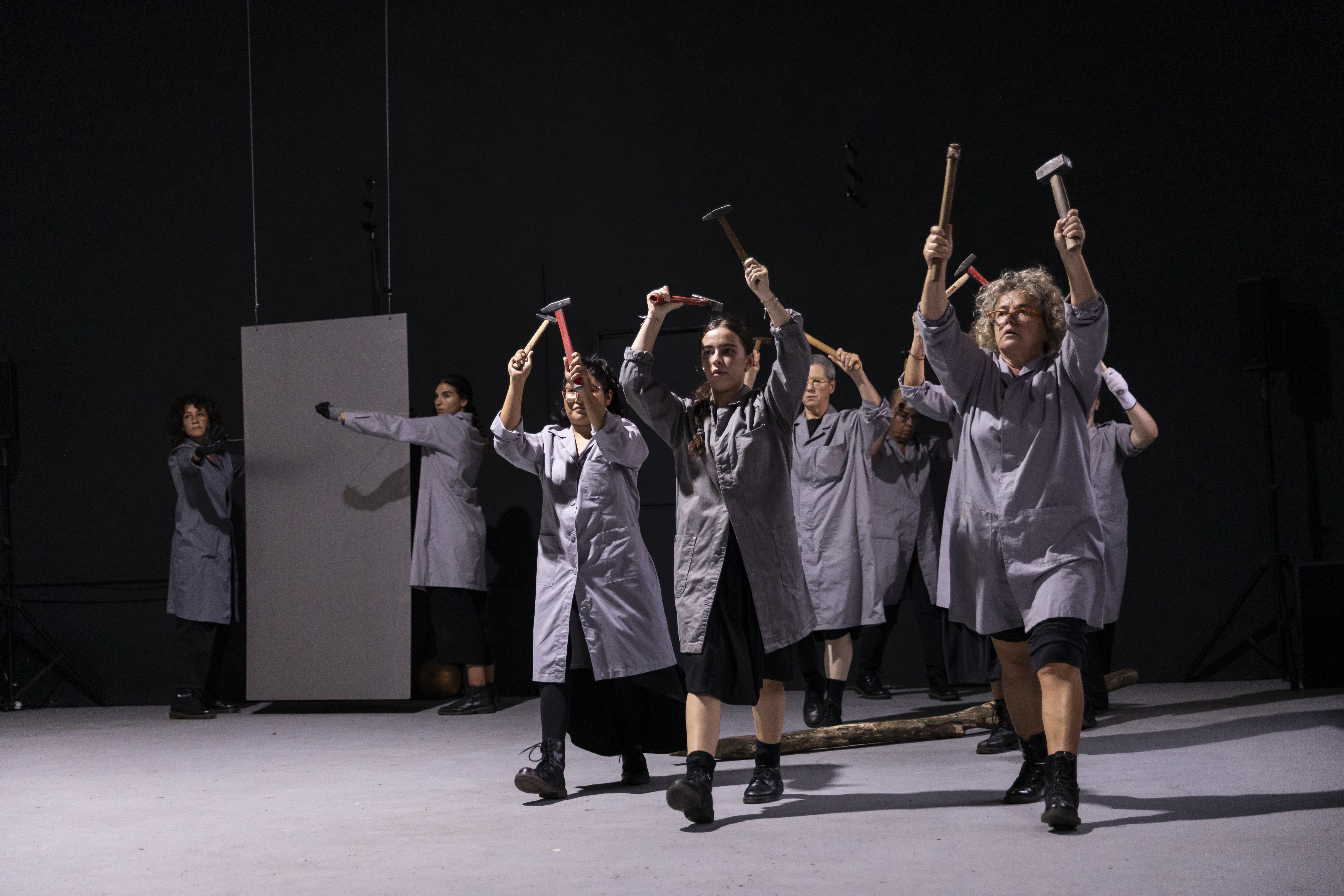 Sono 12 interpreti non professioniste, donne di età compresa tra i 15 e gli 80 anni. Indossano grembiuli azzurri, da operaie. Nella vuota officina dismessa che li accoglie, ci sono, disposti a terra, due tronchi di alberi recisi, una grigia lamiera appesa sul fondo, e due incudini. Su questi, battendovi sopra con dei martelli, estratti, a turno, dalle rispettive tasche, le donne saranno protagoniste di una partitura sonora codificata. Il suono battente, che in più momenti udremo, è parte dell’opera musicale per pianoforte e martello Dies Irae, di Galina Ustvolskaya (1919-2006), rivoluzionaria compositrice russa, anarchica, allieva di Sostakovich (era soprannominata “Donna col Martello”).